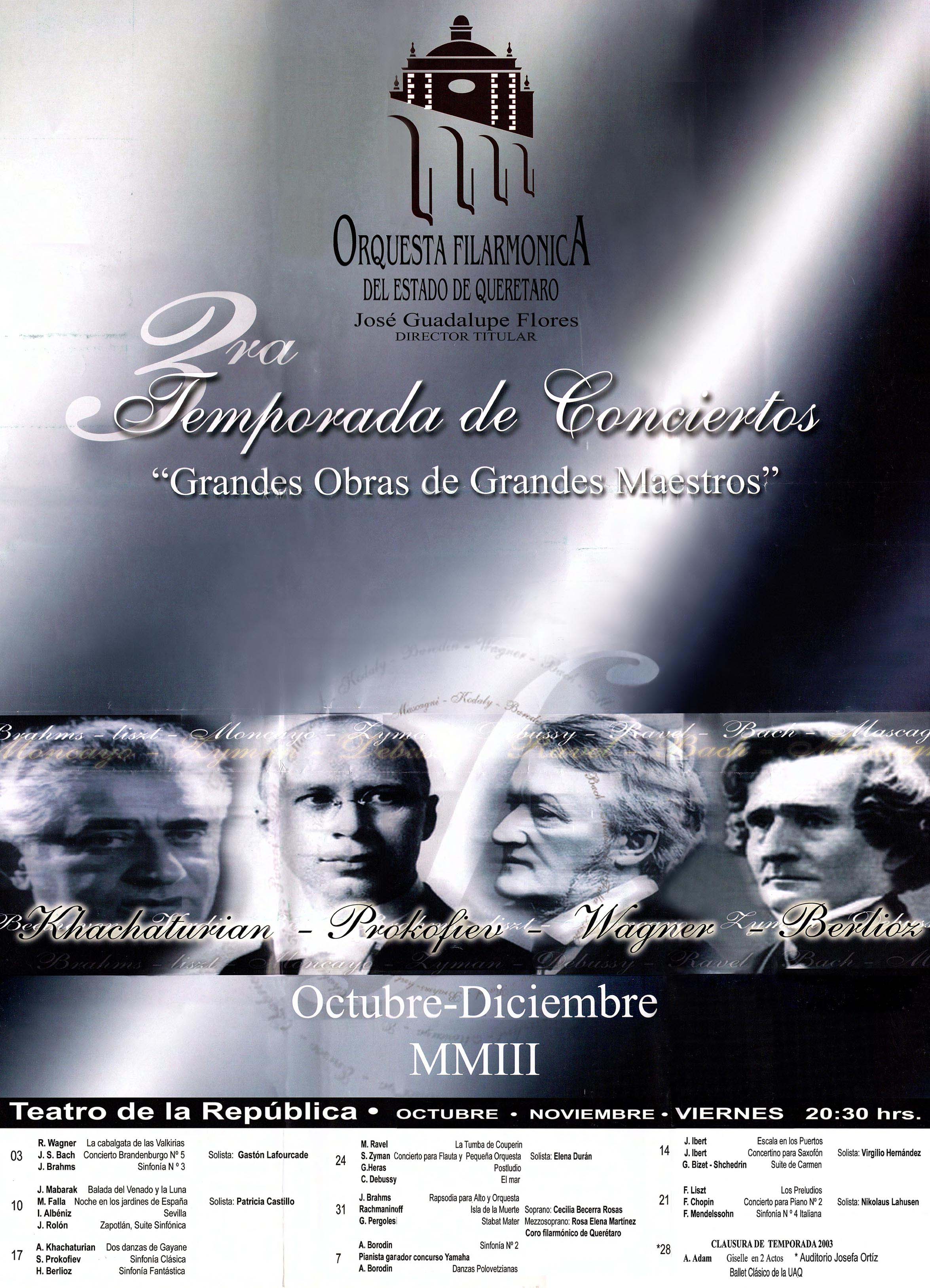 Cartel para la difusión del programa de funciones de la 3era Temporada de Conciertos "Grandes Obras de Grandes Maestros", donde se contó con la participación del Ballet Clásico de Querétaro para la clausura de la temporada 2003.