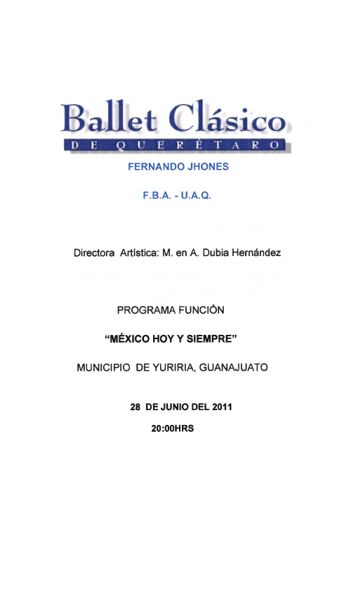 Ballet Clásico de Querétaro Fernando Jhones, “Programa Función México hoy y siempre, Yuriria, Guanajuato,” ReDCA-Ballet, consulta 9 de marzo de 2026, http://redca.uaq.mx/ballet/items/show/590.
