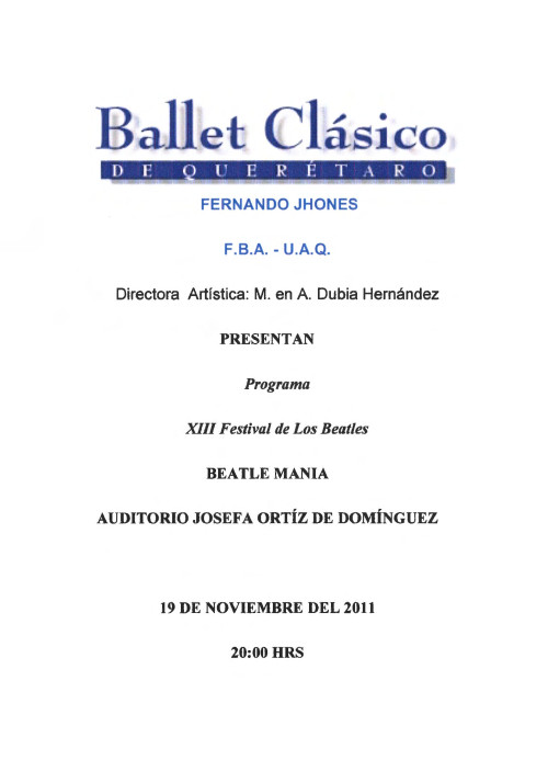 Ballet Clásico de Querétaro Fernando Jhones, “XIII Festival de Los Beatles,” ReDCA-Ballet, consulta 9 de marzo de 2026, http://redca.uaq.mx/ballet/items/show/594.