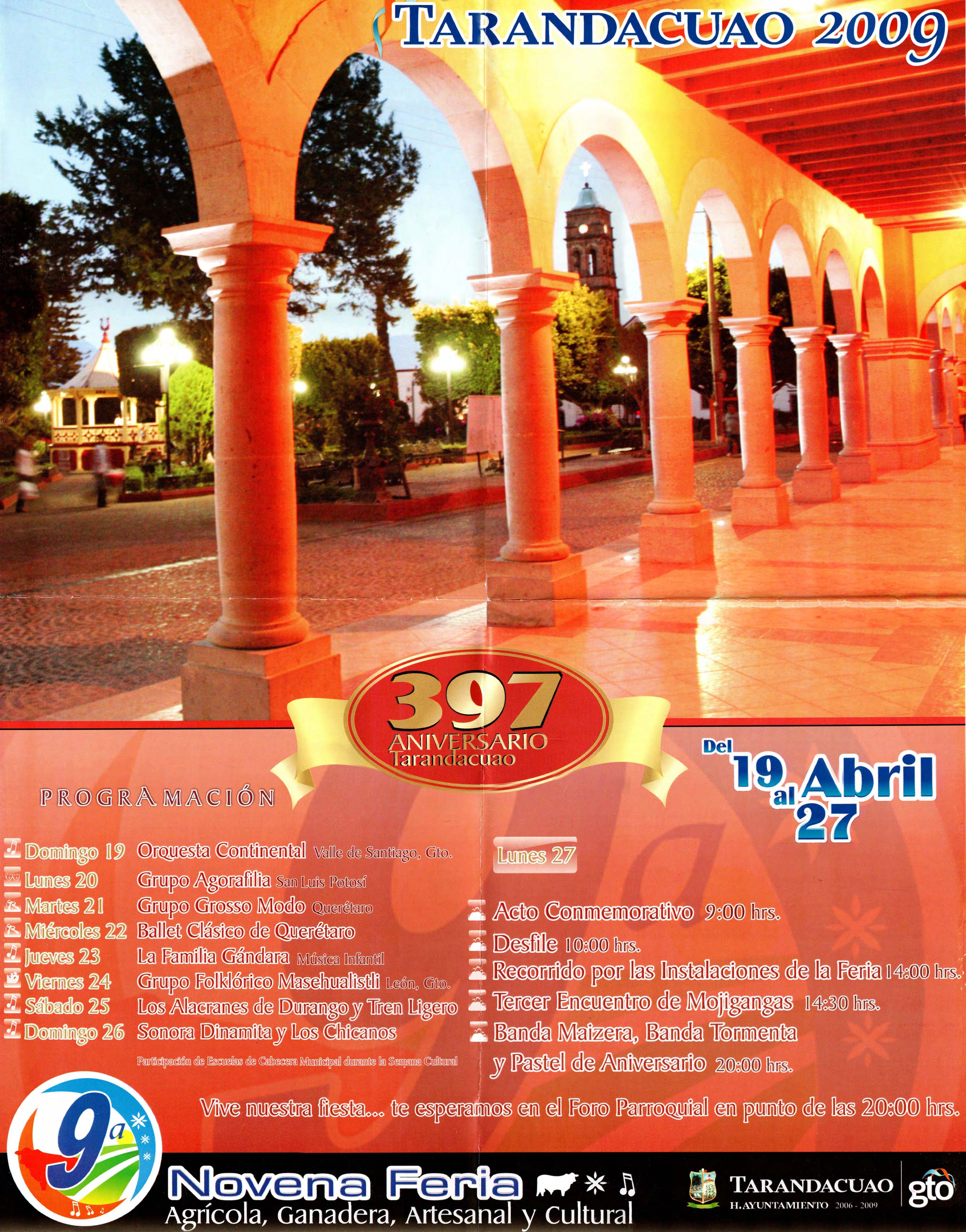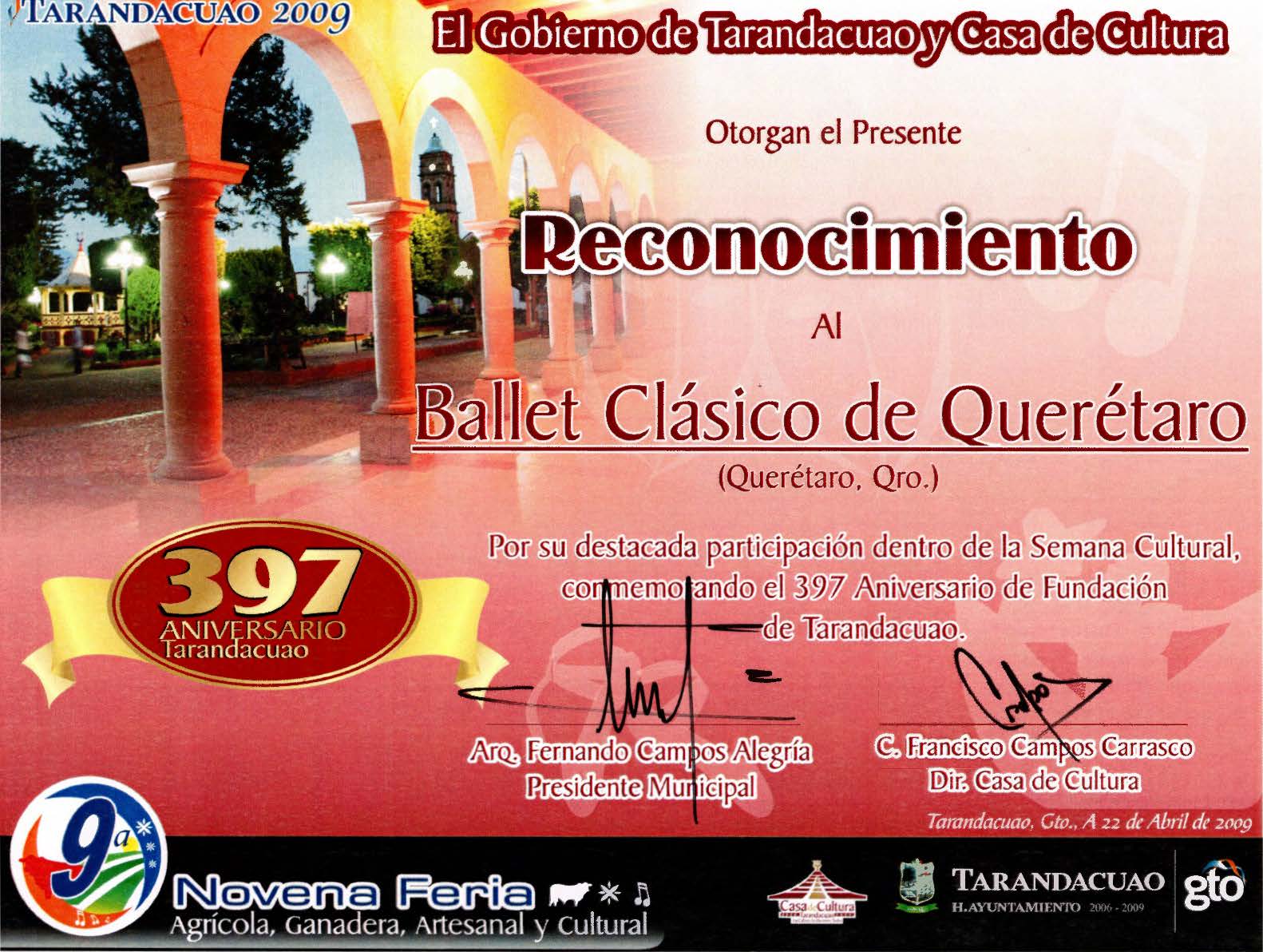 Cartel, programa y reconocimiento del 397 Aniversario del Municipio de Tarandacuao, en el que tuvo participación el Ballet Clásico de Querétaro.