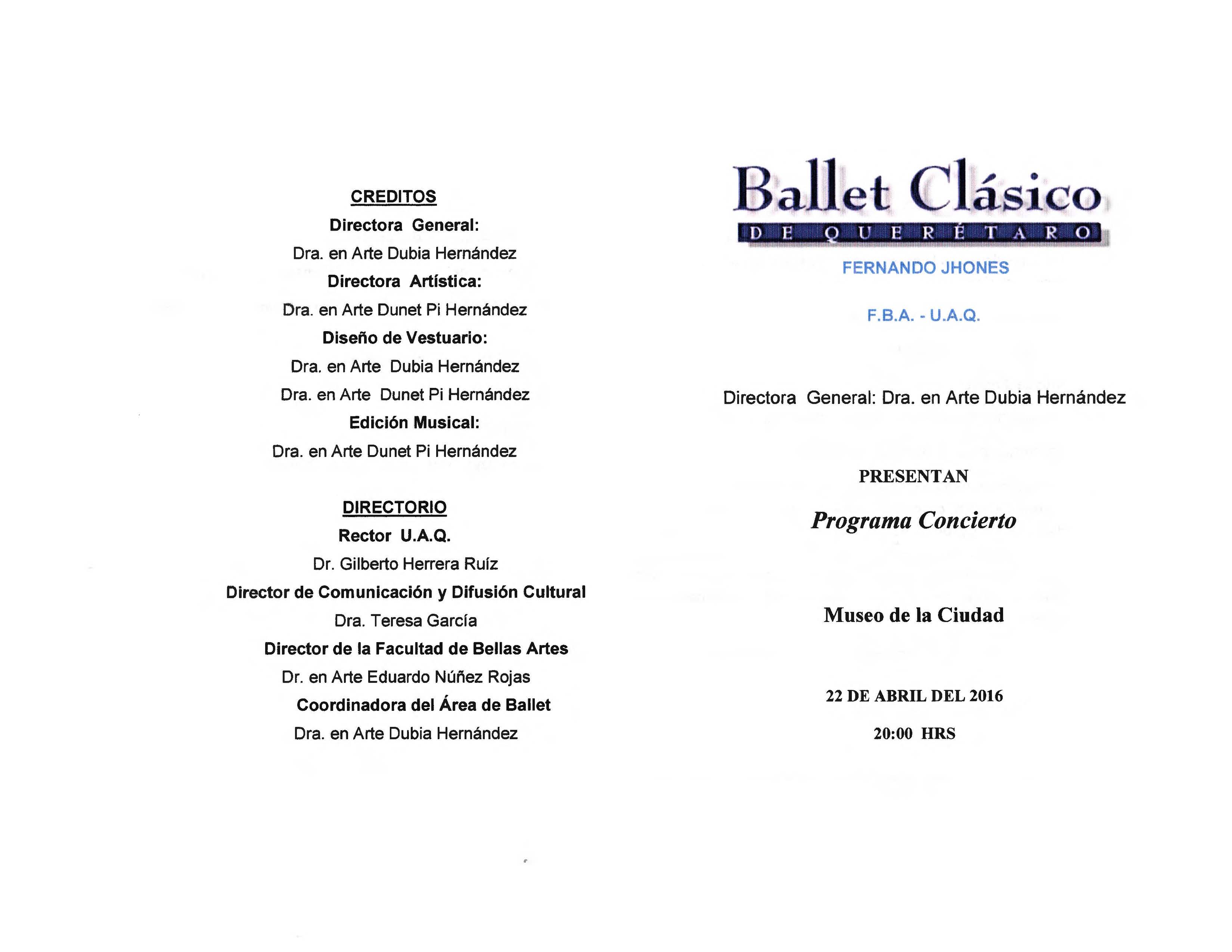 Programa función del Ballet Clásico de Querétaro Fernando Jhones para la presentación en el Museo de la Ciudad de Querétaro.