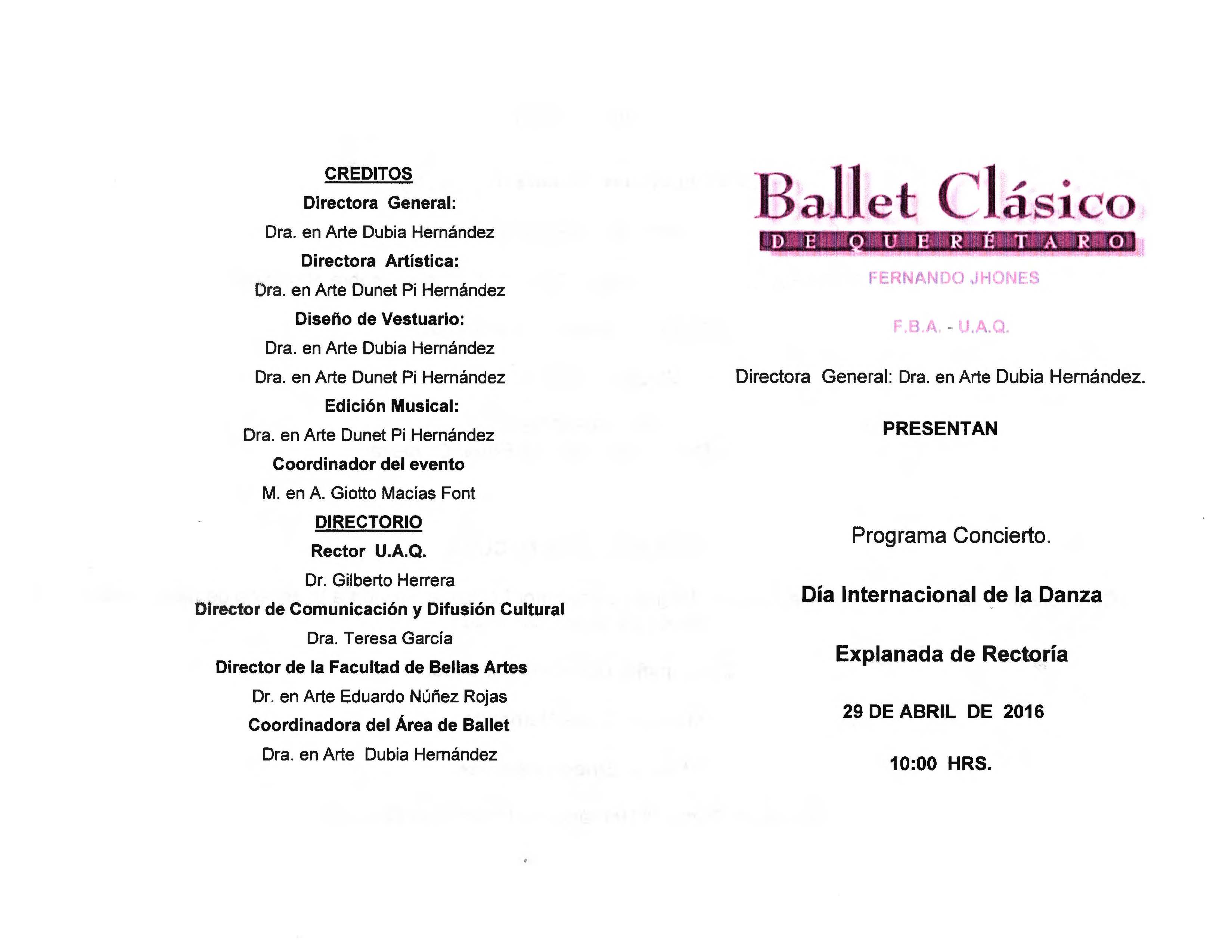 Ballet Clásico de Querétaro Fernando Jhones, “Día Internacional de la Danza 2016,” ReDCA-Ballet, consulta 9 de marzo de 2026, http://redca.uaq.mx/ballet/items/show/601.