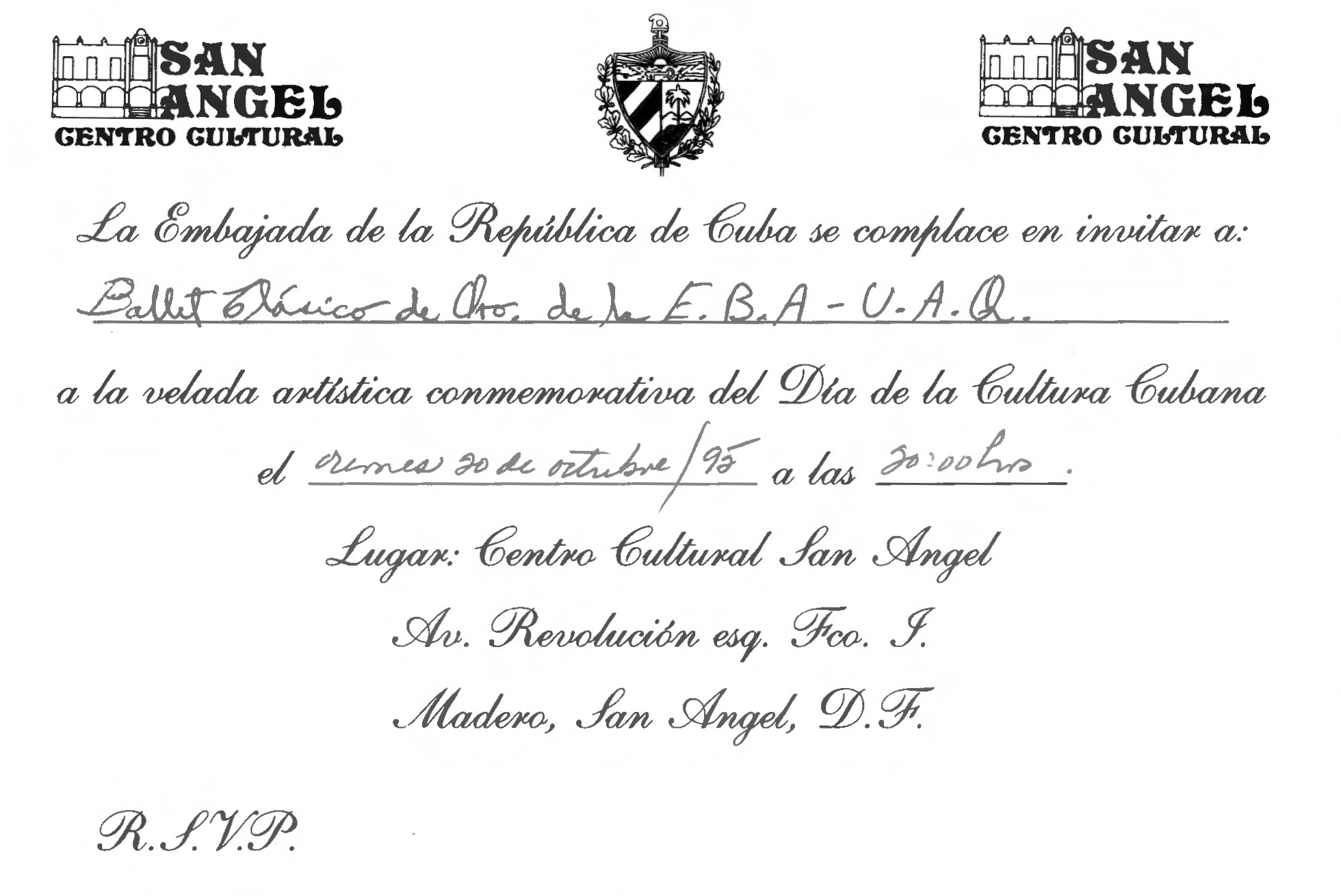 Invitación a la velada artística conmemorativa del Día de la Cultura Cubana, el viernes 20 de octubre de 1995 a las 20 hrs.