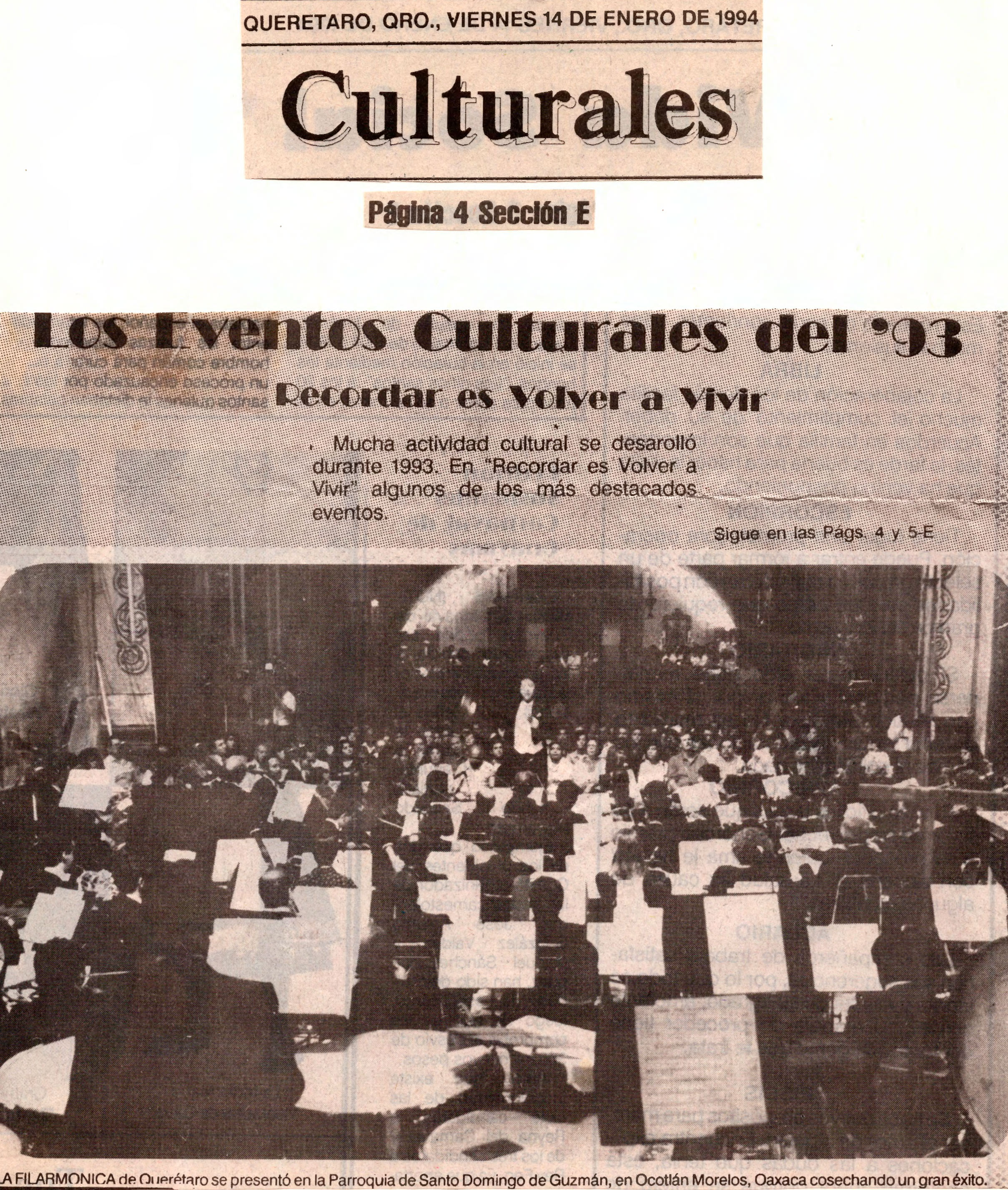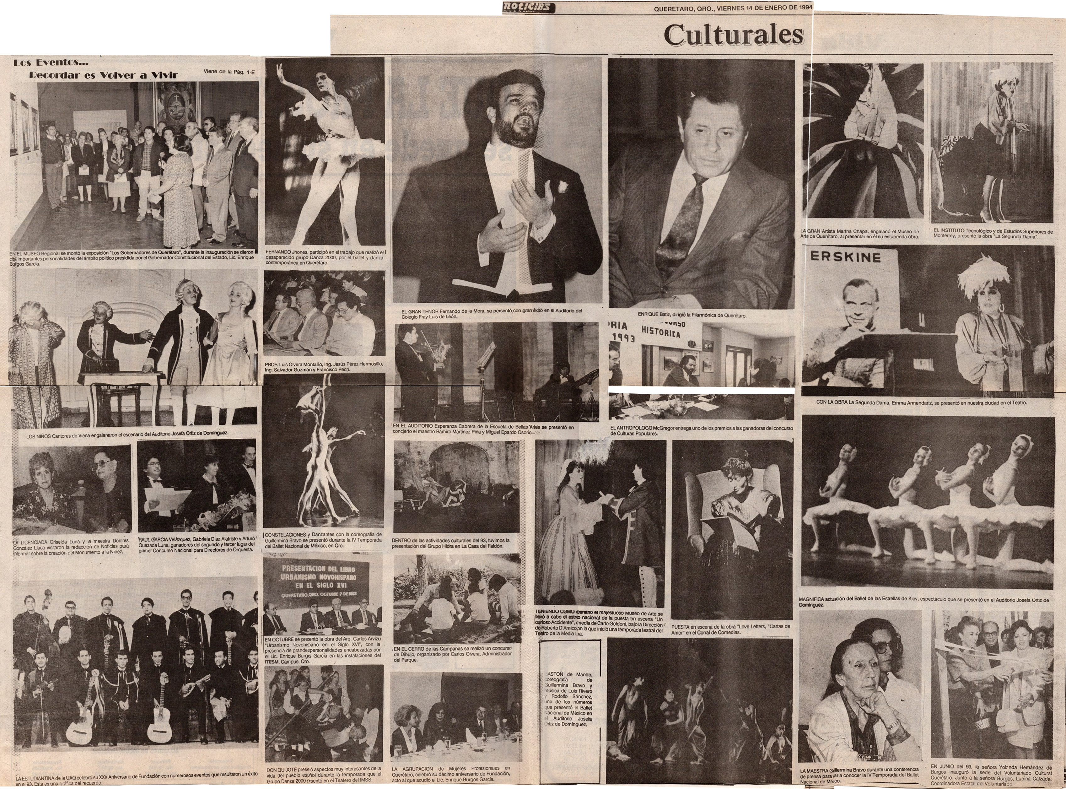 Querétaro, Qro., viernes 14 de enero de 1994 "Culturales". Página 4, sección E. "Los Eventos Culturales del '93". Recordar es volver a vivir. Mucha actividad cultural se desarrolló durante 1993. Noticias