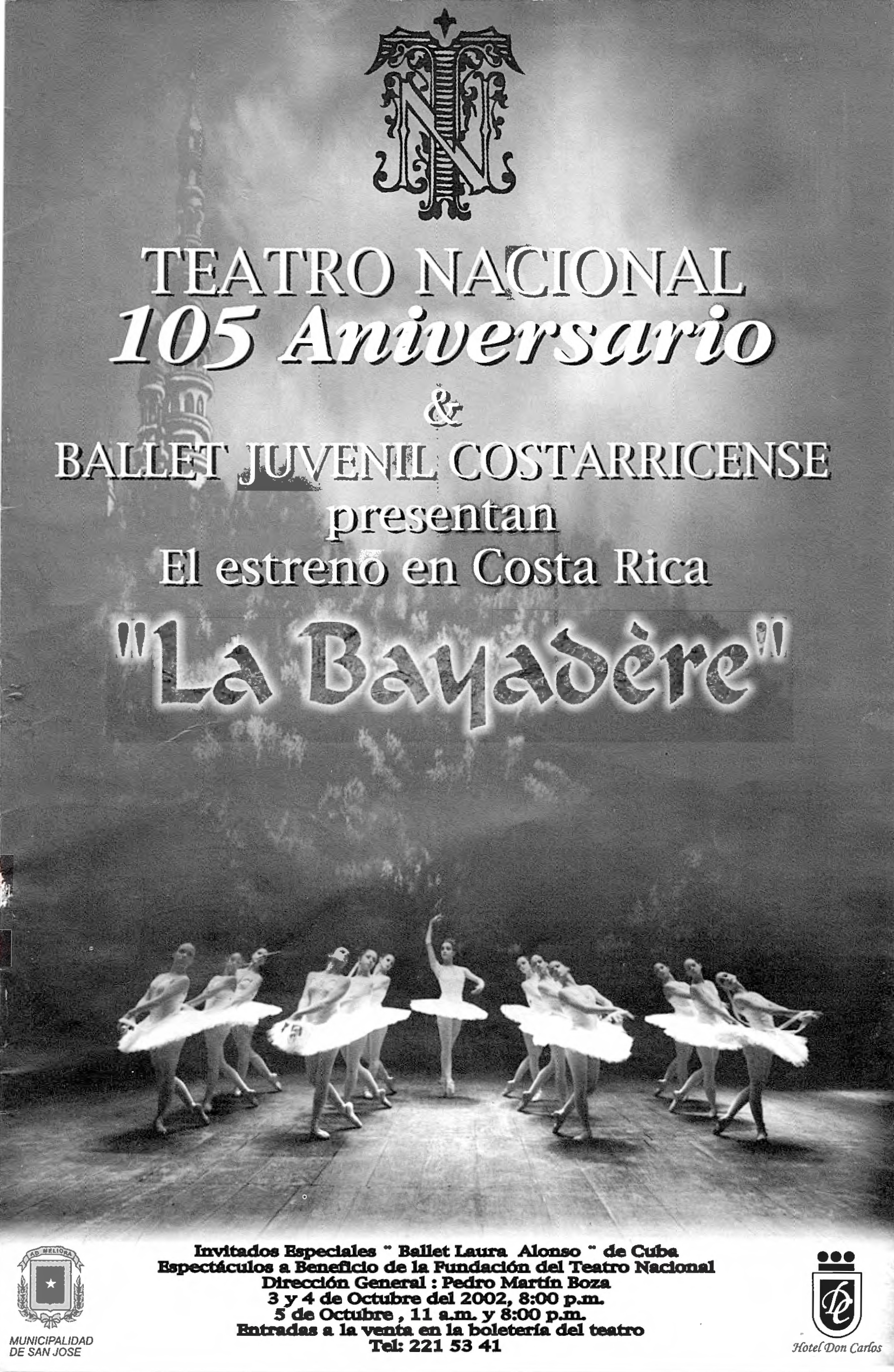 Programa del Teatro Nacional 105 Aniversario y Ballet Juvenil Costarricense presentan el estreno en Costa Rica "La Bayadere". Dirección gral. Pedro Martín Boza.3 y 4 de octubre de 2002 a las 20 hrs.