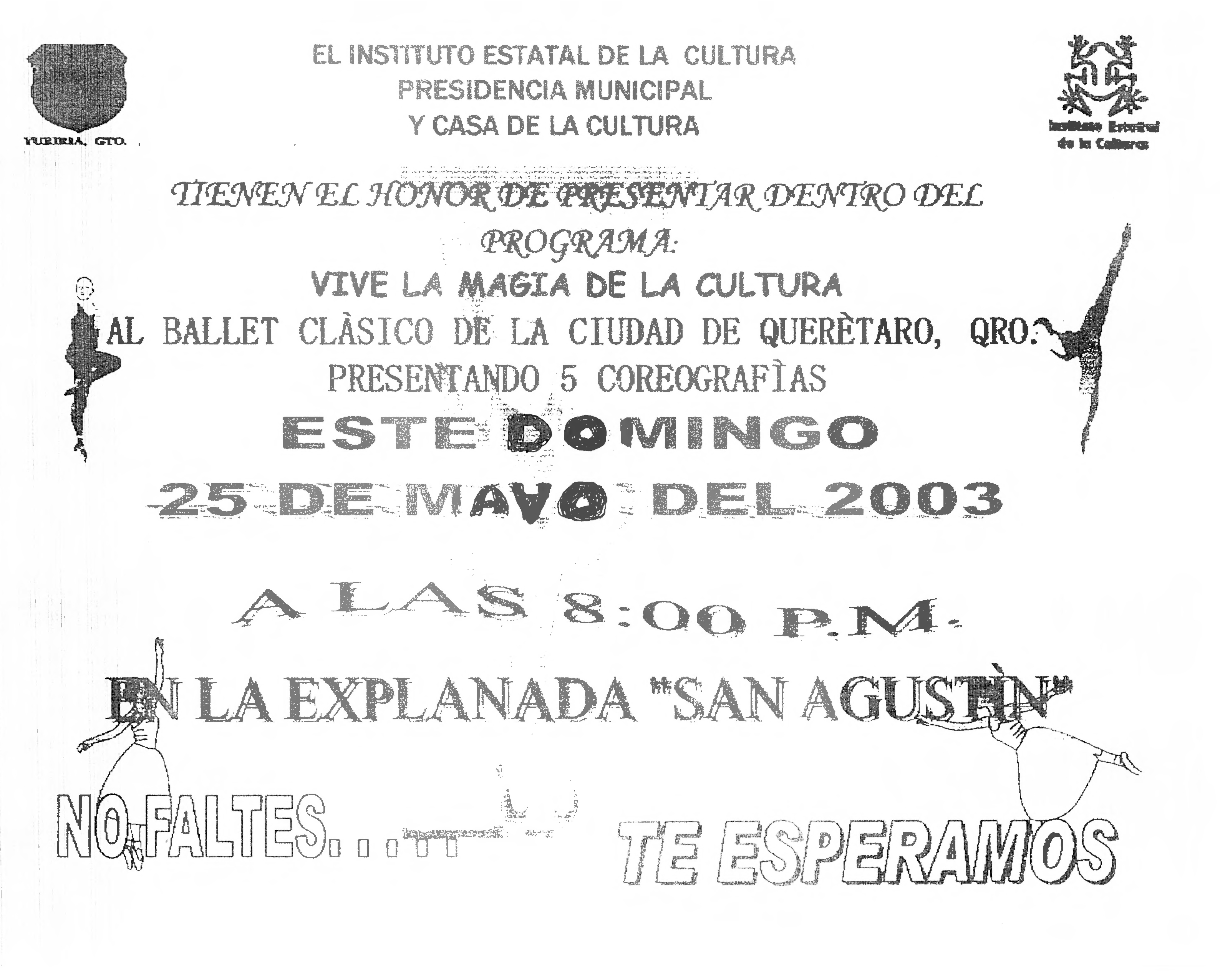 Invitación a la presentación el domingo 25 de mayo de 2003 a las 8:00 pm. por el programa "Vive la magia de la cultura" con la presentación de 5 coreografías del Ballet