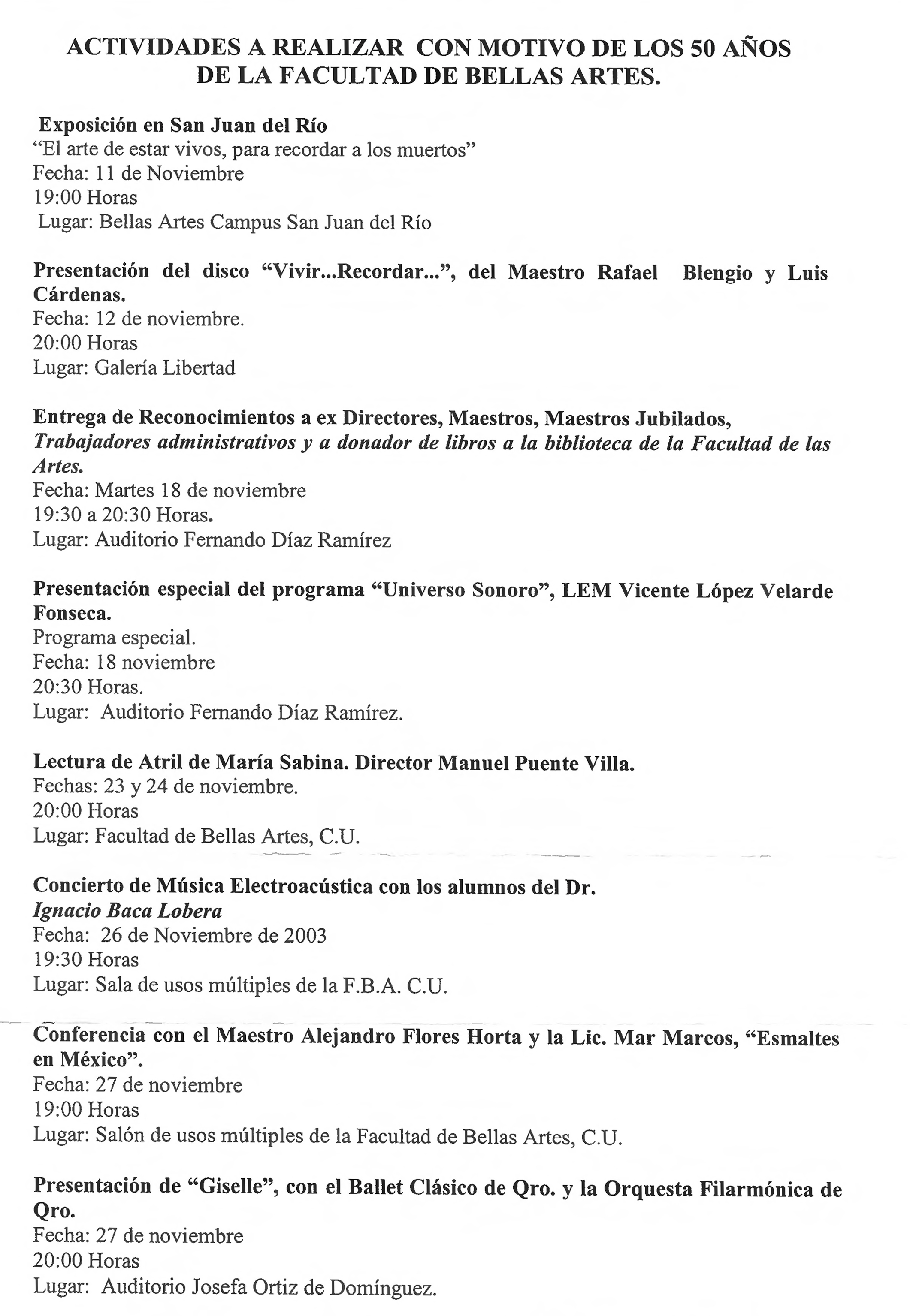 Programa de las Actividades a realizar con motivo de los 50 años de la FBA, el 27 de noviembre a las 20 hrs. en el Auditorio Josefa Ortiz de Domínguez