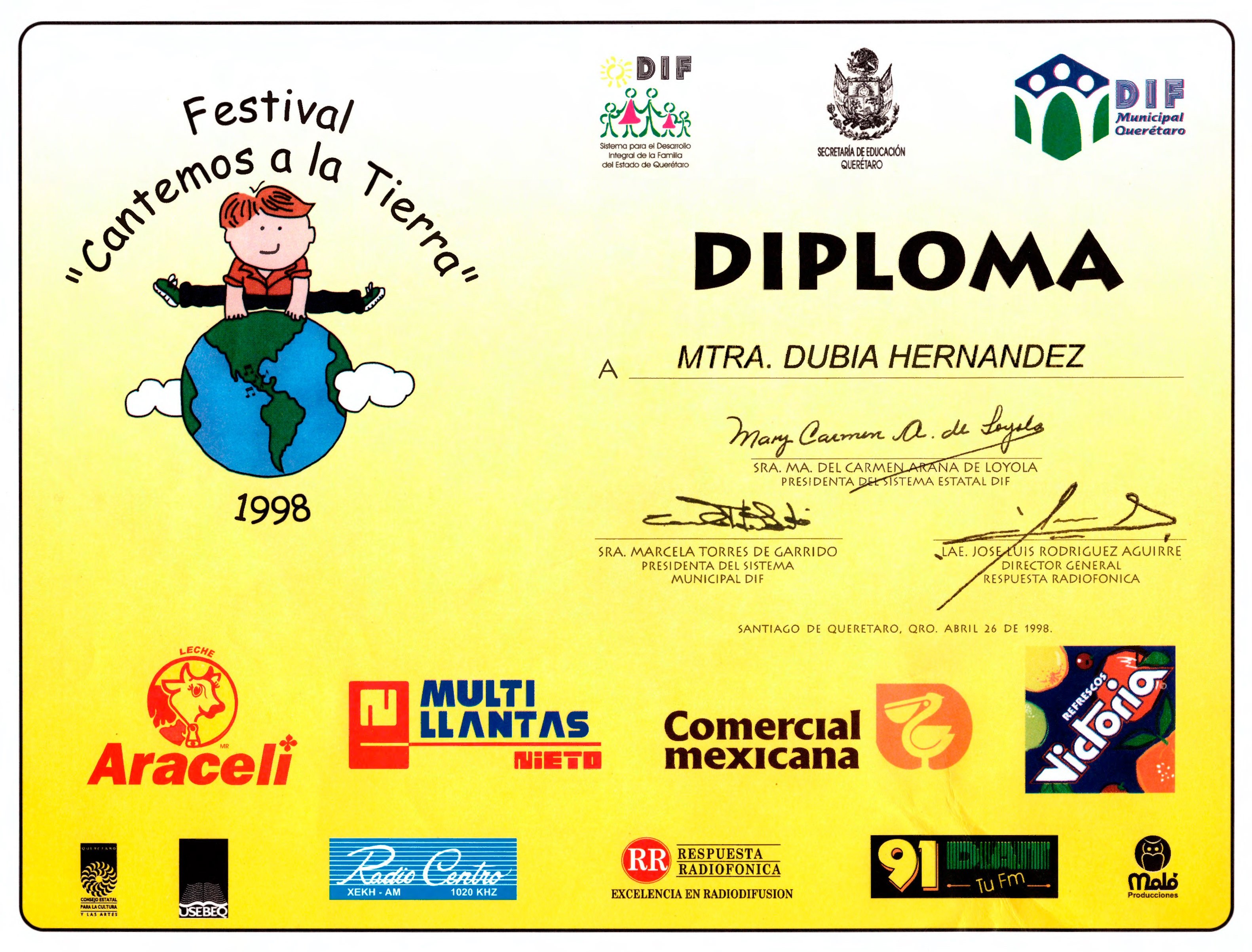 Reconocimiento a Mtra. Dubia Hernández por participación en el Festival "Cantemos a la Tierra" el 26 de abril de 1998