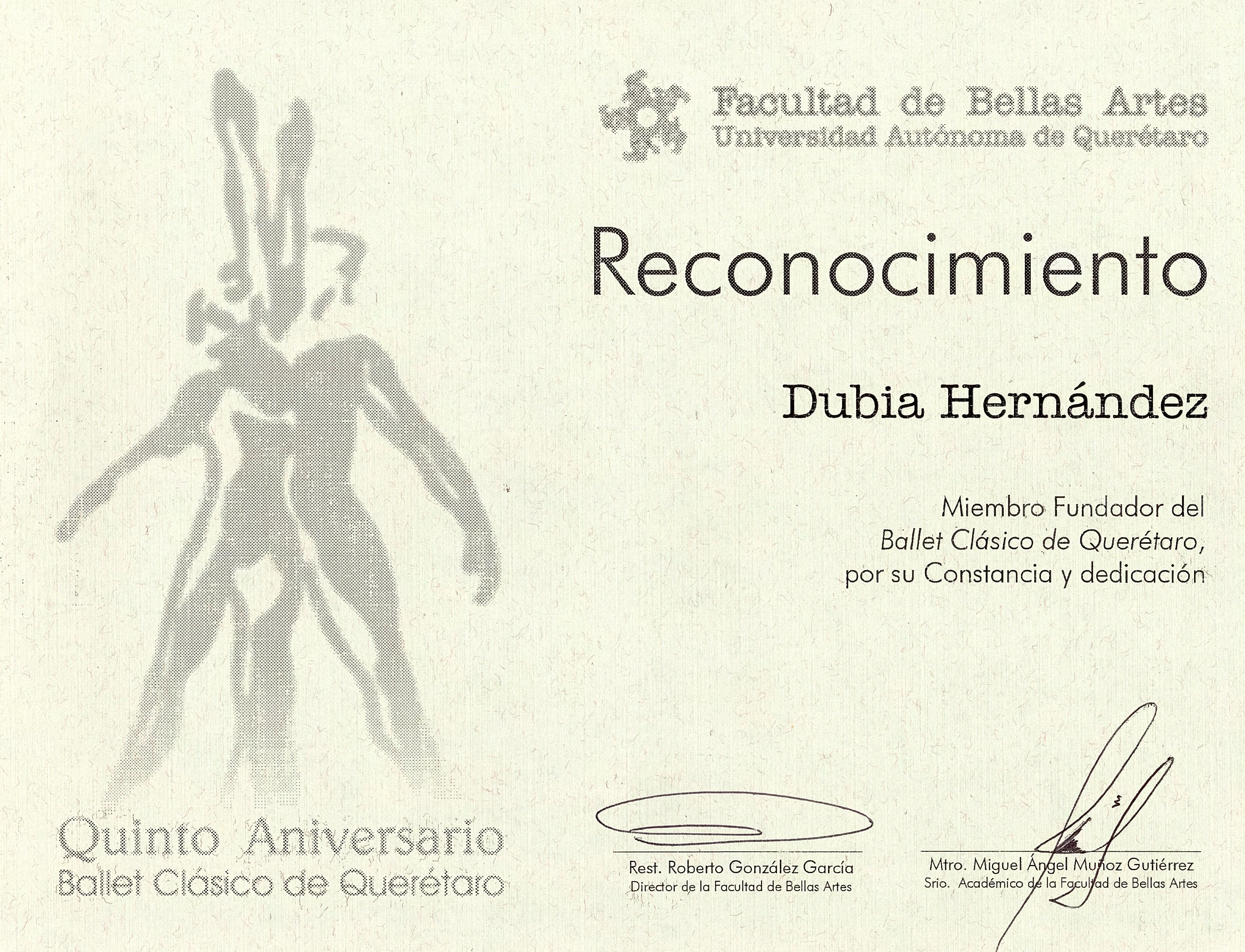 Reconocimiento a Dubia por ser miembro fundador del Ballet Clásico de Qro. por su constancia y dedicación