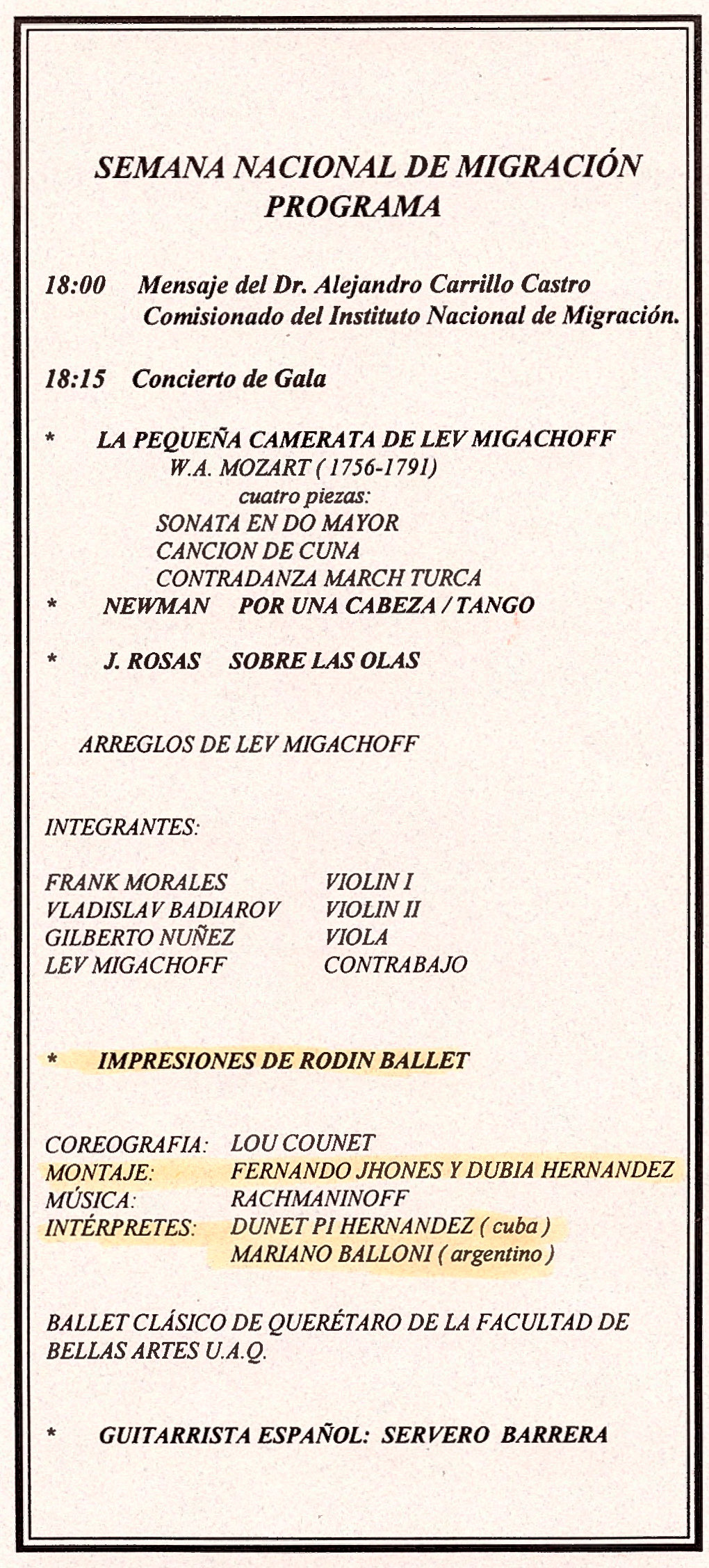 Programa de la presentación en la Semana Nacional de Migración con "Impresiones de Rodin" ballet