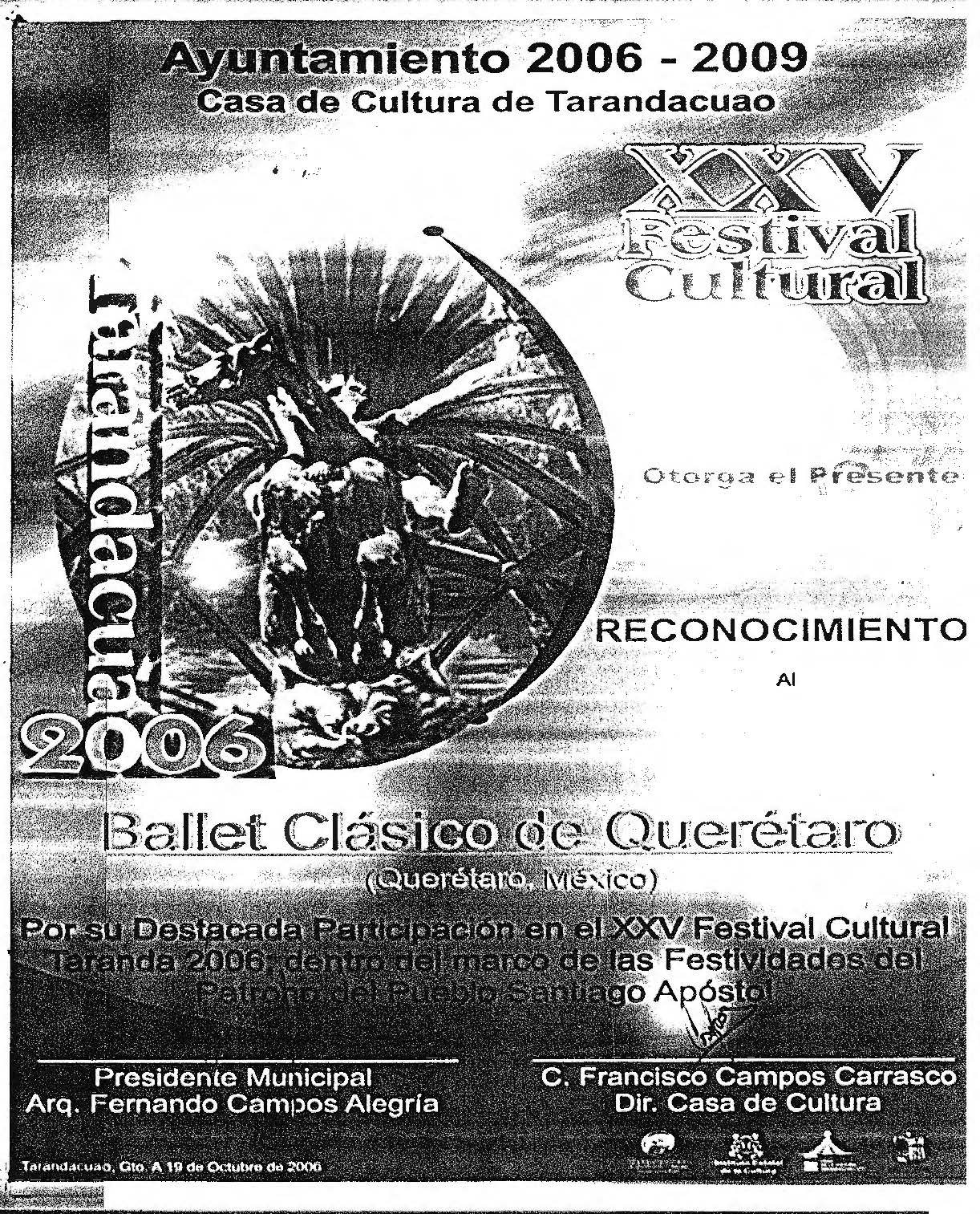Cartel y programa para el XXV Festival Cultural-Tarandacua 2006. Programa y reconocimiento de la presentación del Balet Clásico de Querétaro en este evento.