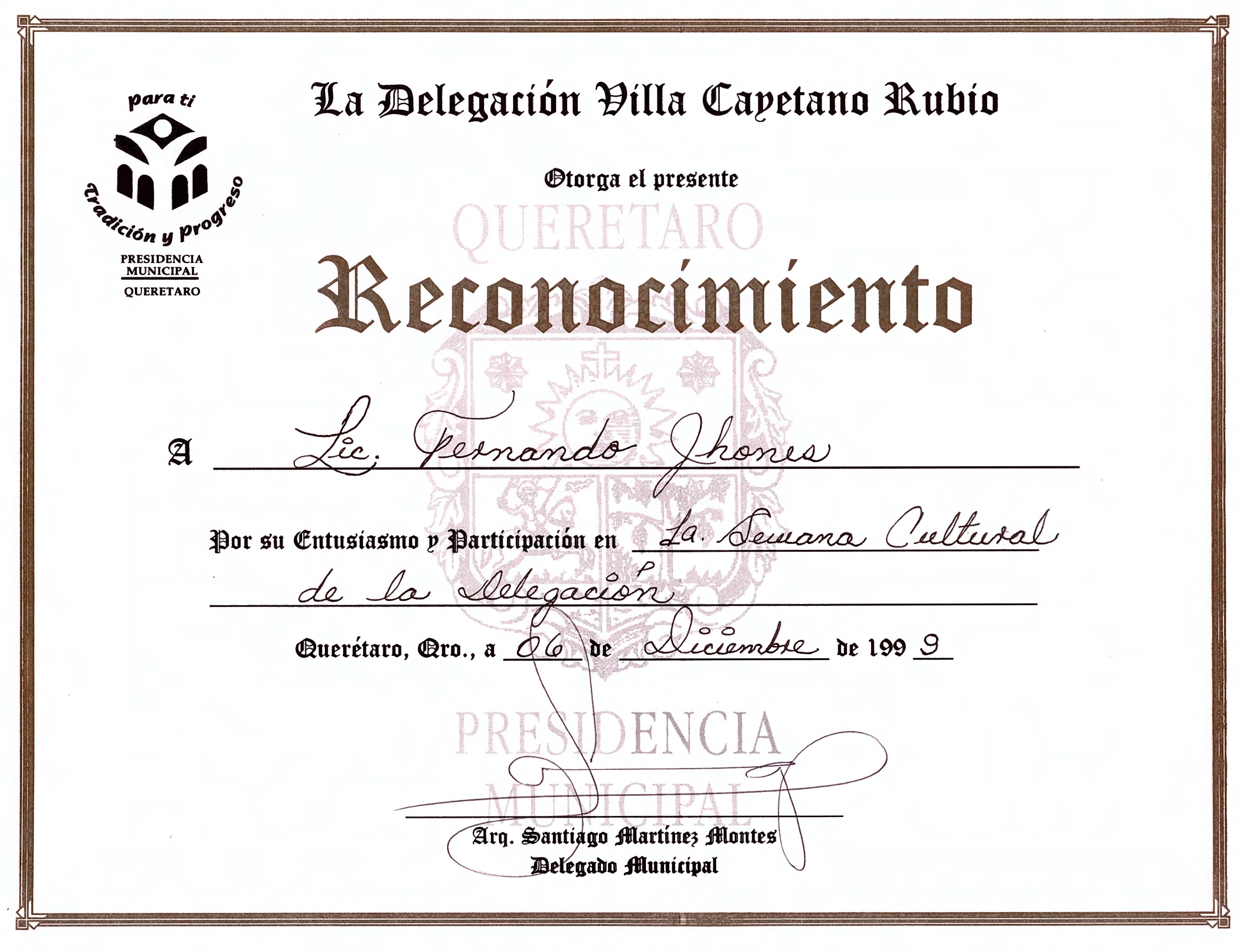 Reconocimiento por participación en la Semana Cultural de la Delegación Villa Cayetano Rubio, el día 6 de diciembre de 1999