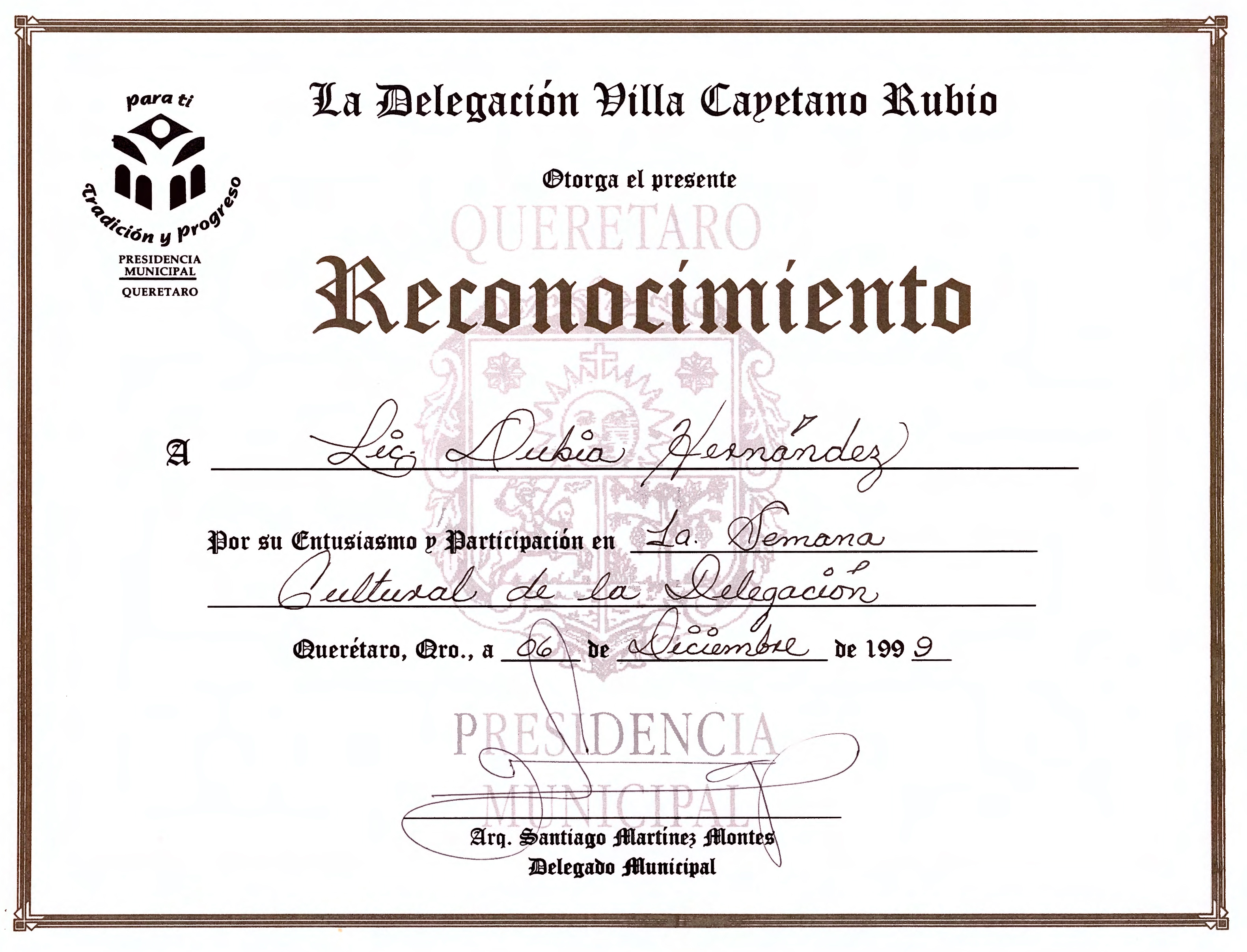 Reconocimiento por participación en la Semana Cultural de la Delegación Villa Cayetano Rubio, el día 6 de diciembre de 1999