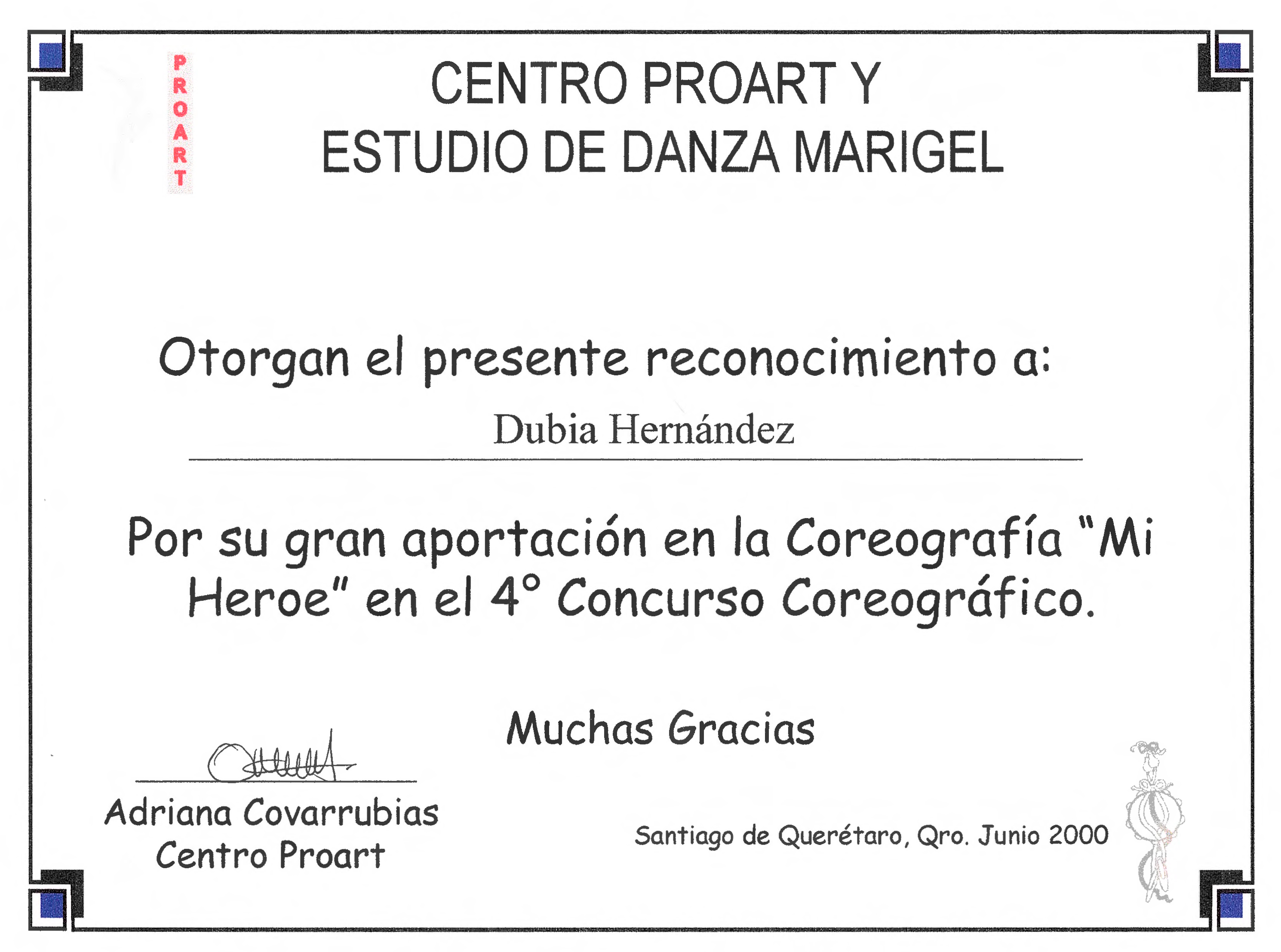 Reconocimiento por aportación en la Coreografía "Mi Héroe" en el 4to Concurso Coreográfico
