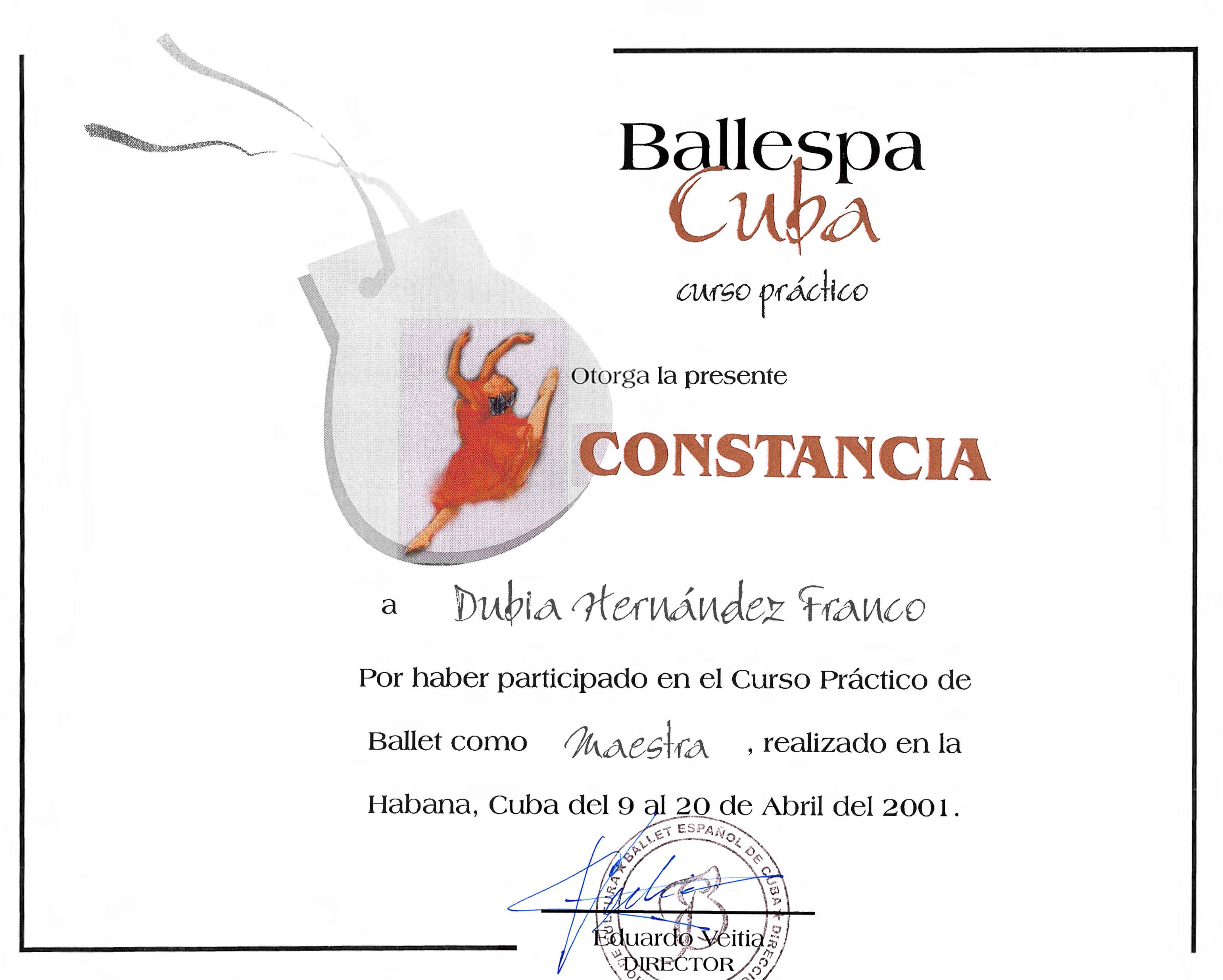 Constancia por participación en el Curso Práctico de Ballet como maestra, realizado en la Habana, Cuba del 9 al 20 de Abril de 2001