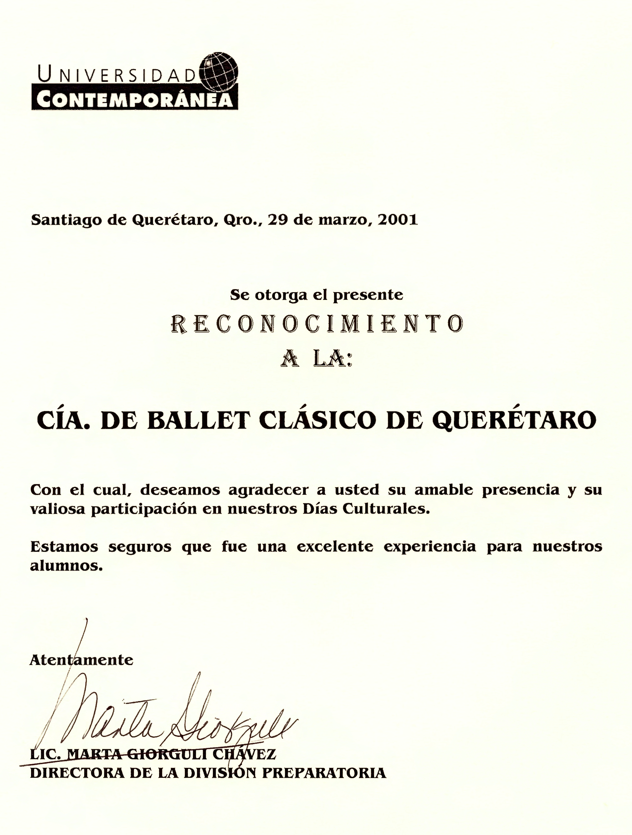 Ballet Clásico de Querétaro, “Reconocimiento participación en Días Culturales Universidad Contemporánea,” ReDCA-Ballet, consulta 9 de marzo de 2026, http://redca.uaq.mx/ballet/items/show/668.