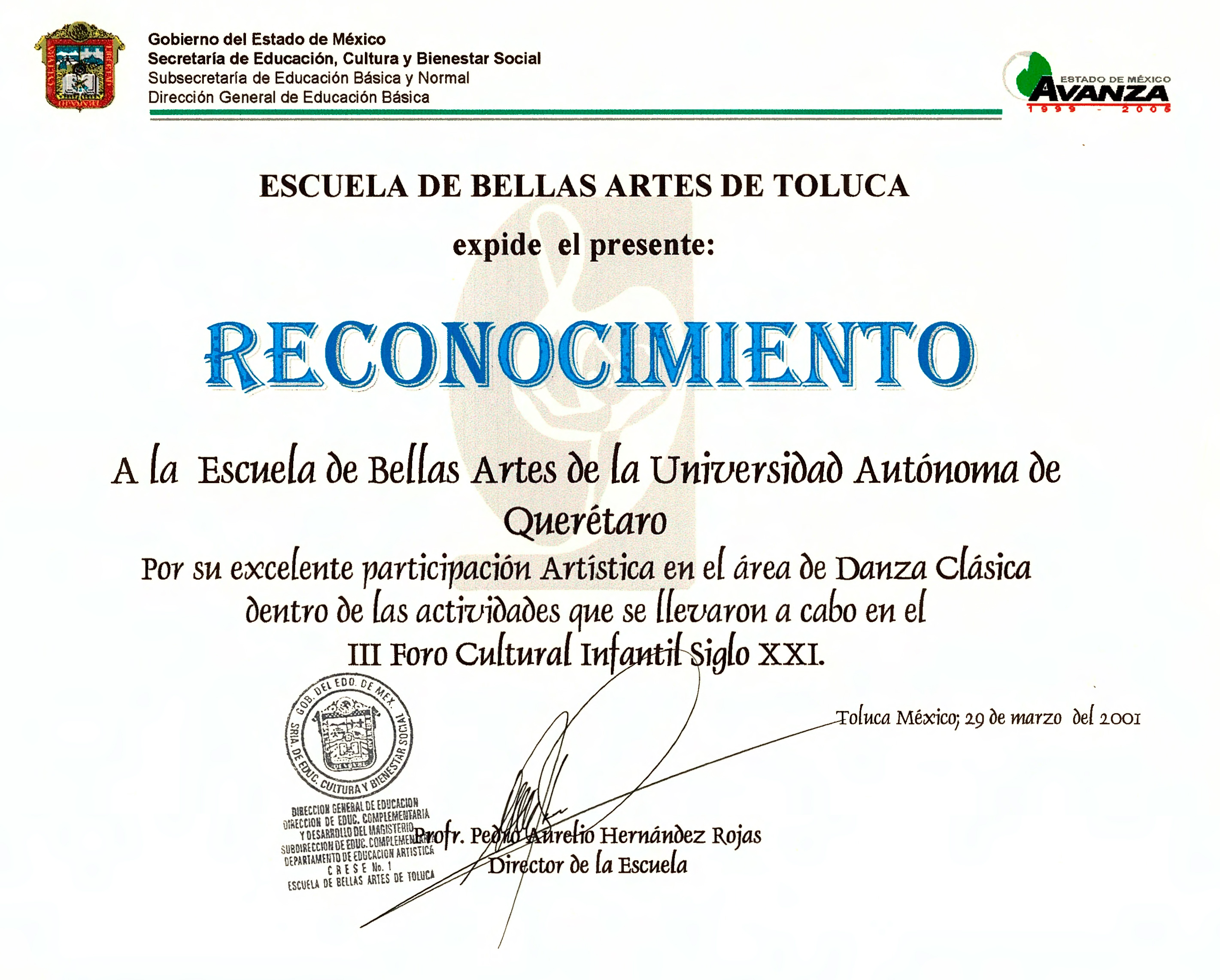 Reconocimiento a la EBA de la UAQ por su excelente participación Artística en el área de Danza Clásica dentro de las actividades del III Foro Cultural Infantil siglo XXI