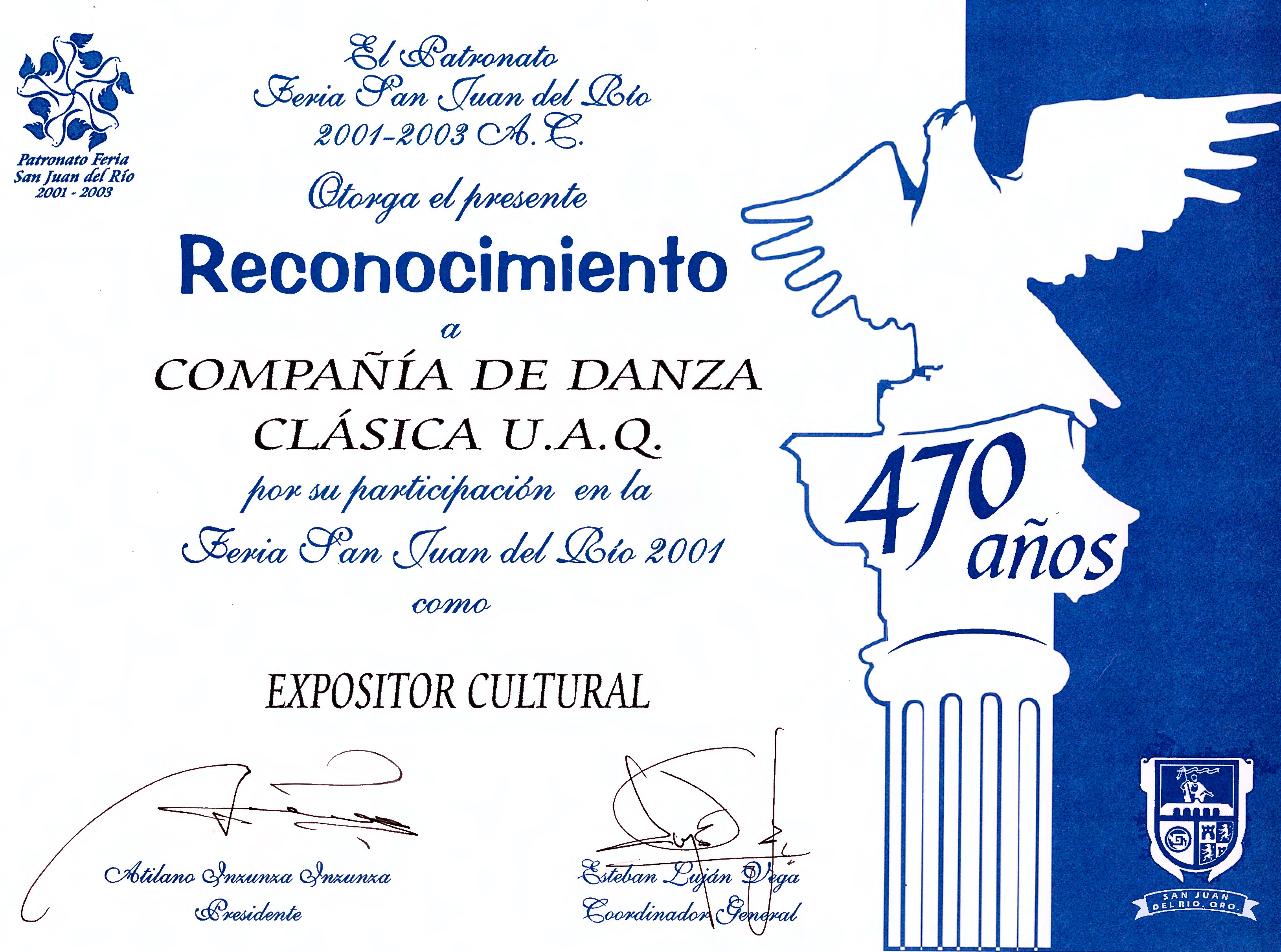 Ballet Clásico de Querétaro, “Reconocimiento por participación en la Feria San Juan del Río 2001,” ReDCA-Ballet, consulta 9 de marzo de 2026, http://redca.uaq.mx/ballet/items/show/673.