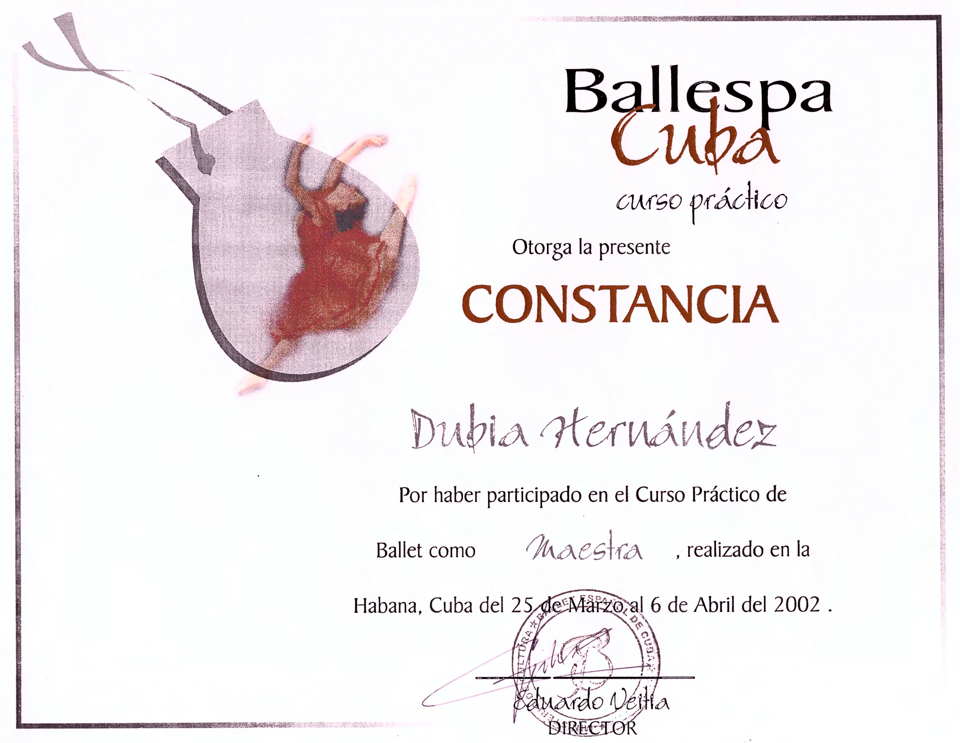 Constancia por participación en el Curso Práctico de Ballet como maestra, realizado en la Habana del 25 de marzo al 6 de abril de 2002; otorgado por Ballespa Cuba-curso práctico