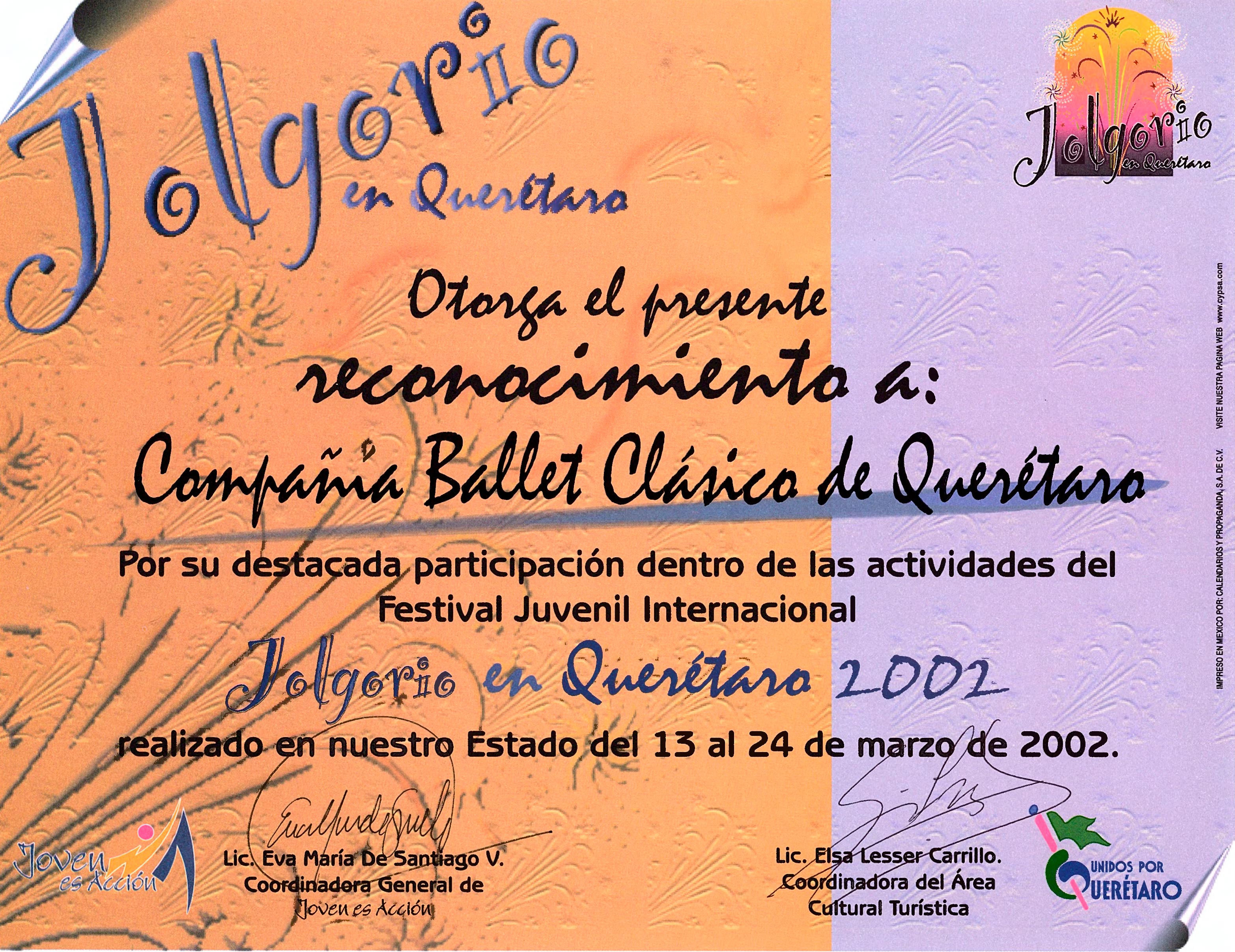 Reconocimiento por participación dentro de las actividades del Festival Juvenil Internacional "Jolgorio en Querétaro 2002", realizado del 13 al 24 de marzo