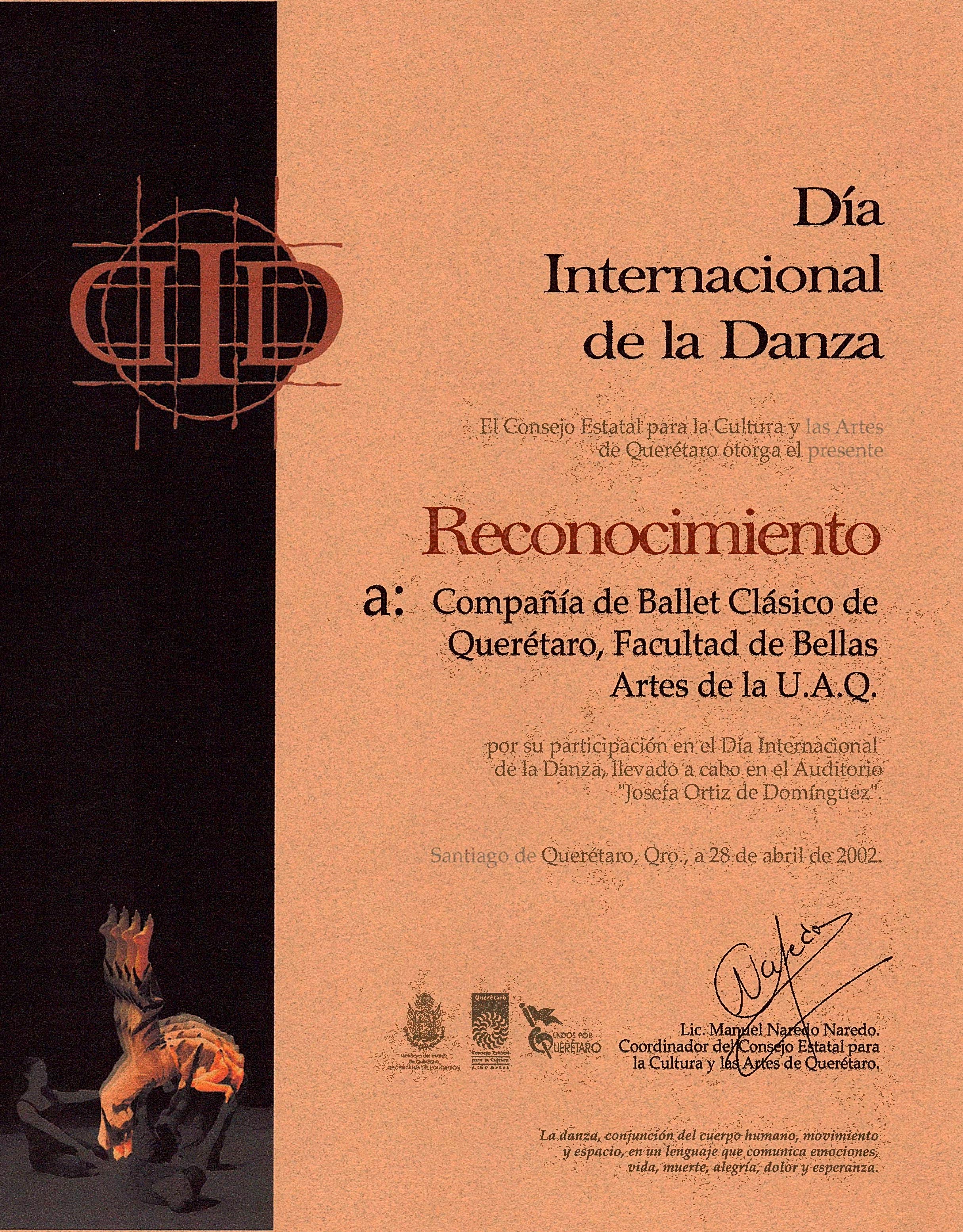 Ballet Clásico de Querétaro, “Reconocimiento por participación en el Día Internacional de la Danza 2002,” ReDCA-Ballet, consulta 9 de marzo de 2026, http://redca.uaq.mx/ballet/items/show/681.