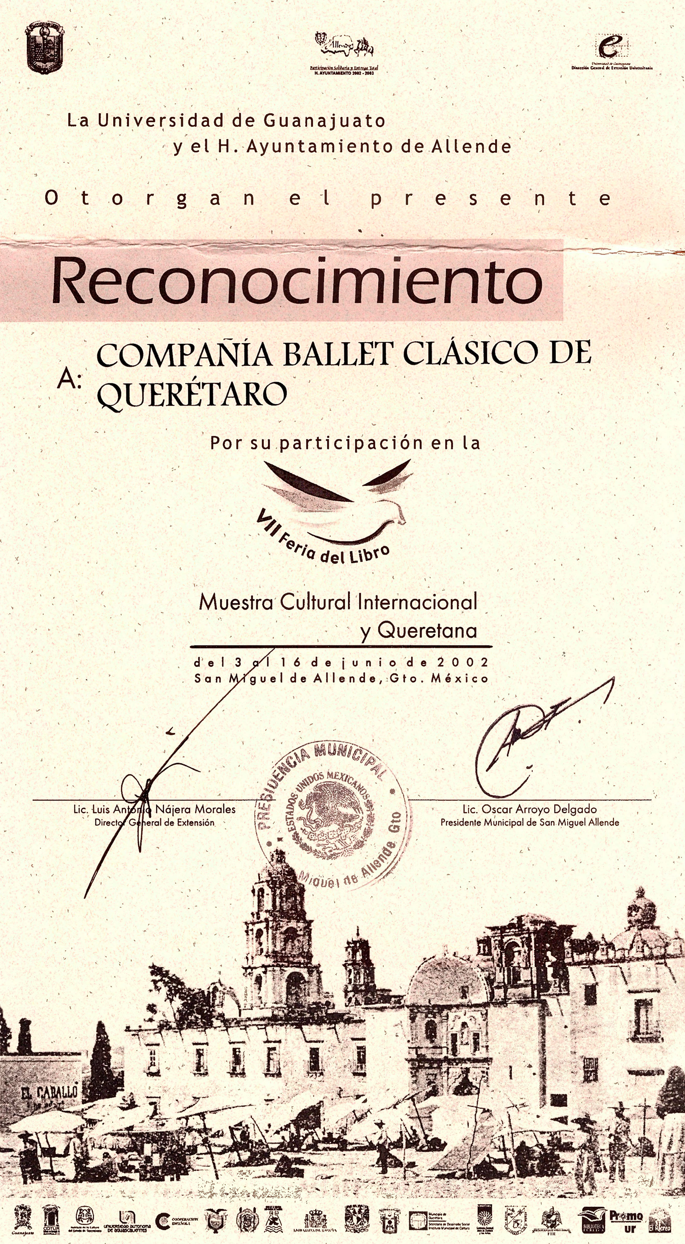 Reconocimiento por participación en la VII Feria del Libro "Muestra Cultural Internacional y Queretana" del 3 al 16 de junio de 2002