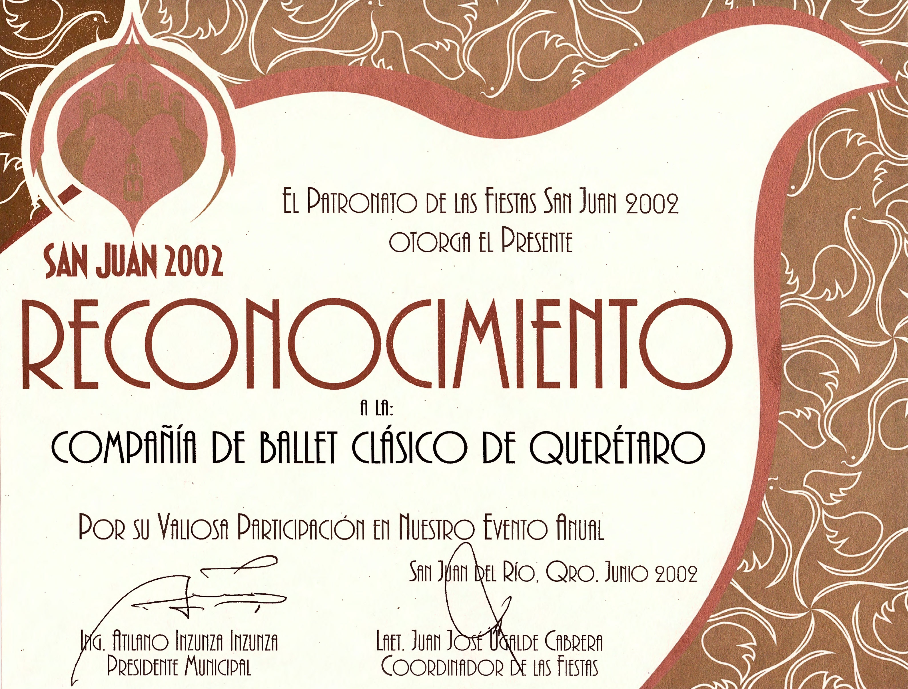 Ballet Clásico de Querétaro, “Reconocimiento por participación en las Fiestas San Juan 2002,” ReDCA-Ballet, consulta 9 de marzo de 2026, http://redca.uaq.mx/ballet/items/show/685.