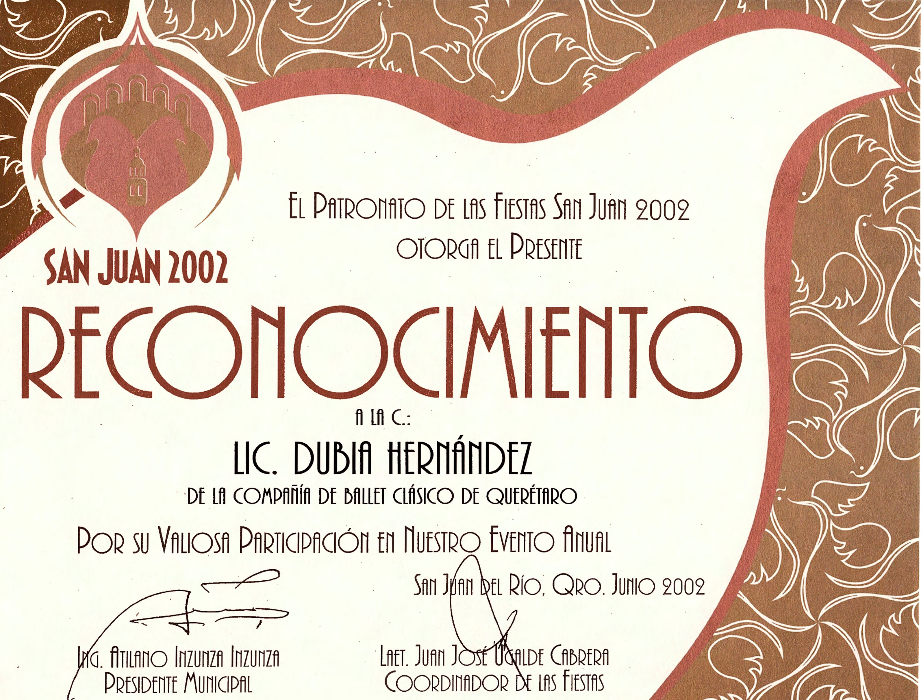 Dubia Hernández, “Reconocimiento por participación en las Fiestas San Juan 2002,” ReDCA-Ballet, consulta 9 de marzo de 2026, http://redca.uaq.mx/ballet/items/show/686.