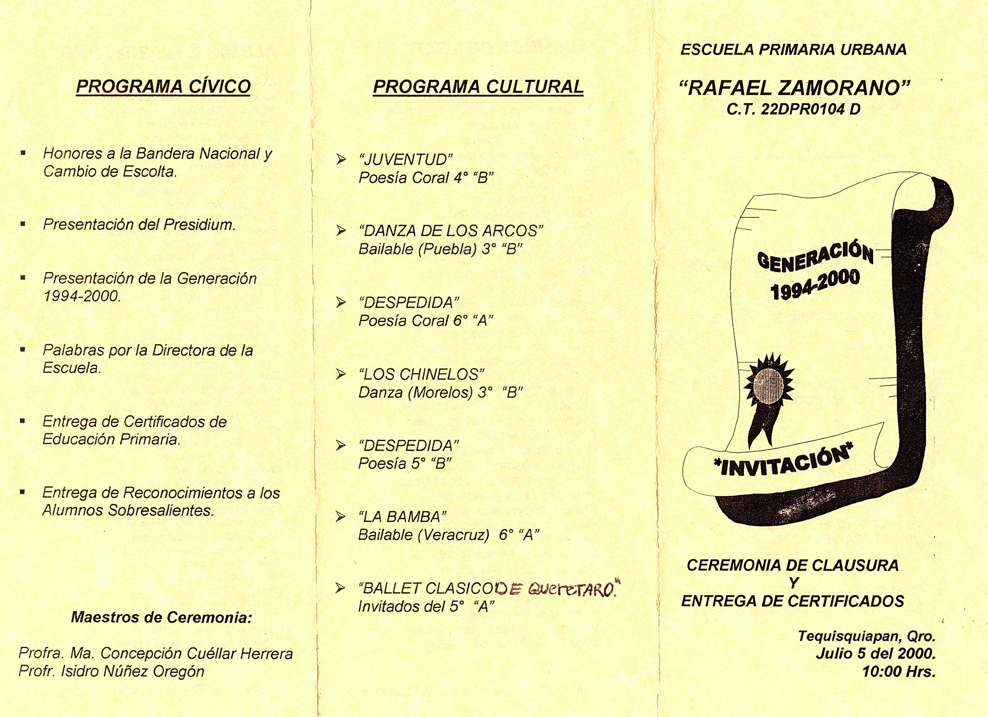 Programa para celebrar la clausura de la generación 1994-2000, presentación dentro del programa cultural como Invitados 5° "A" en la Escuela primaria urbana "Rafael Zamorano"