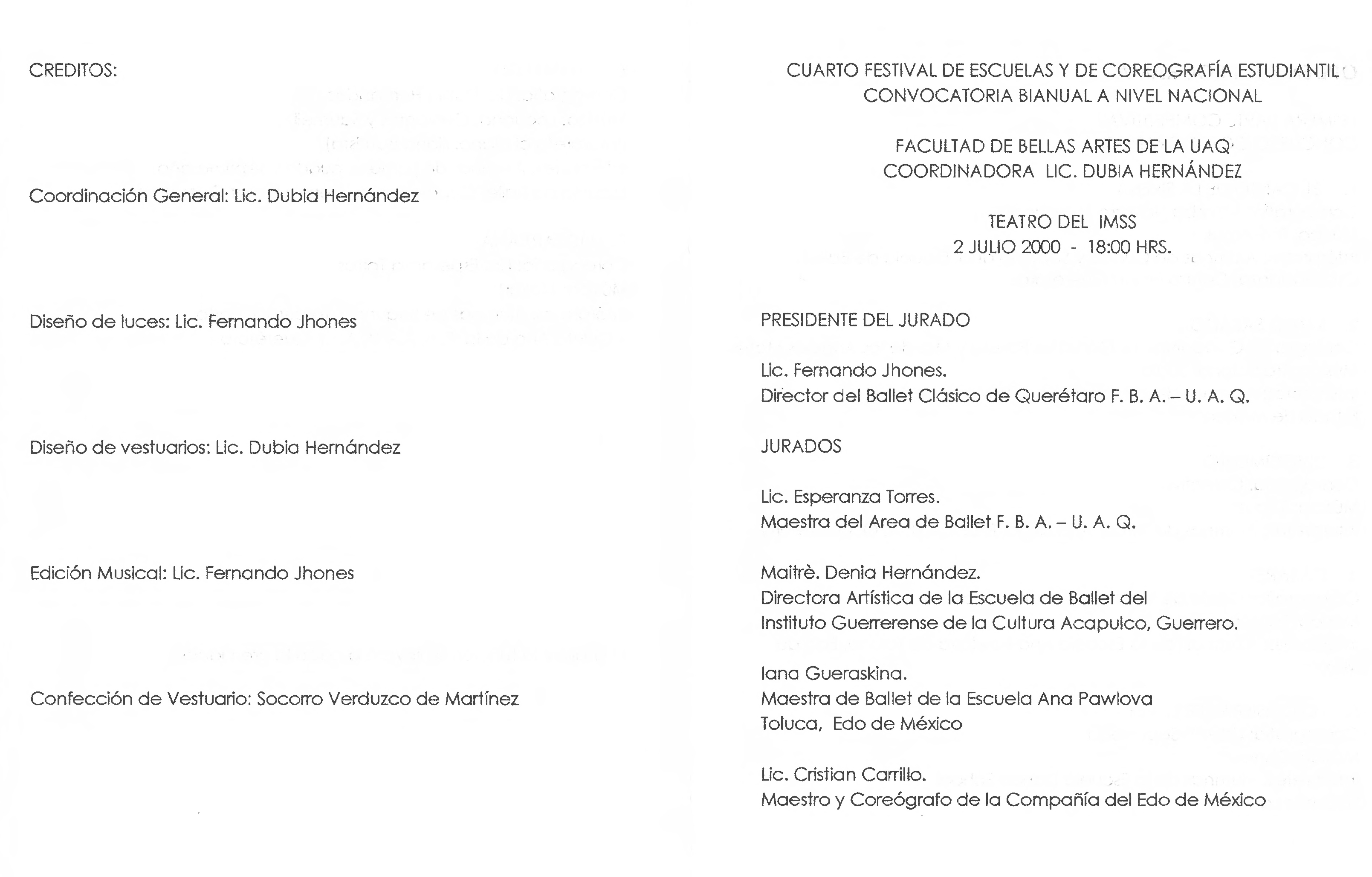 Programa de la Convocatoria Bianual a nivel nacional en el Teatro del IMSS el 2 de julio de 2000 a las 18 hrs. con la primera parte competitiva-concurso coreográfico: 1.El canto de la sirena, 2.Santo sábado, 3.Divertimento, 4.Cabaret, 5.Yo quisiera ser el rey, 6.Nostalgia, 7.Mozartiana