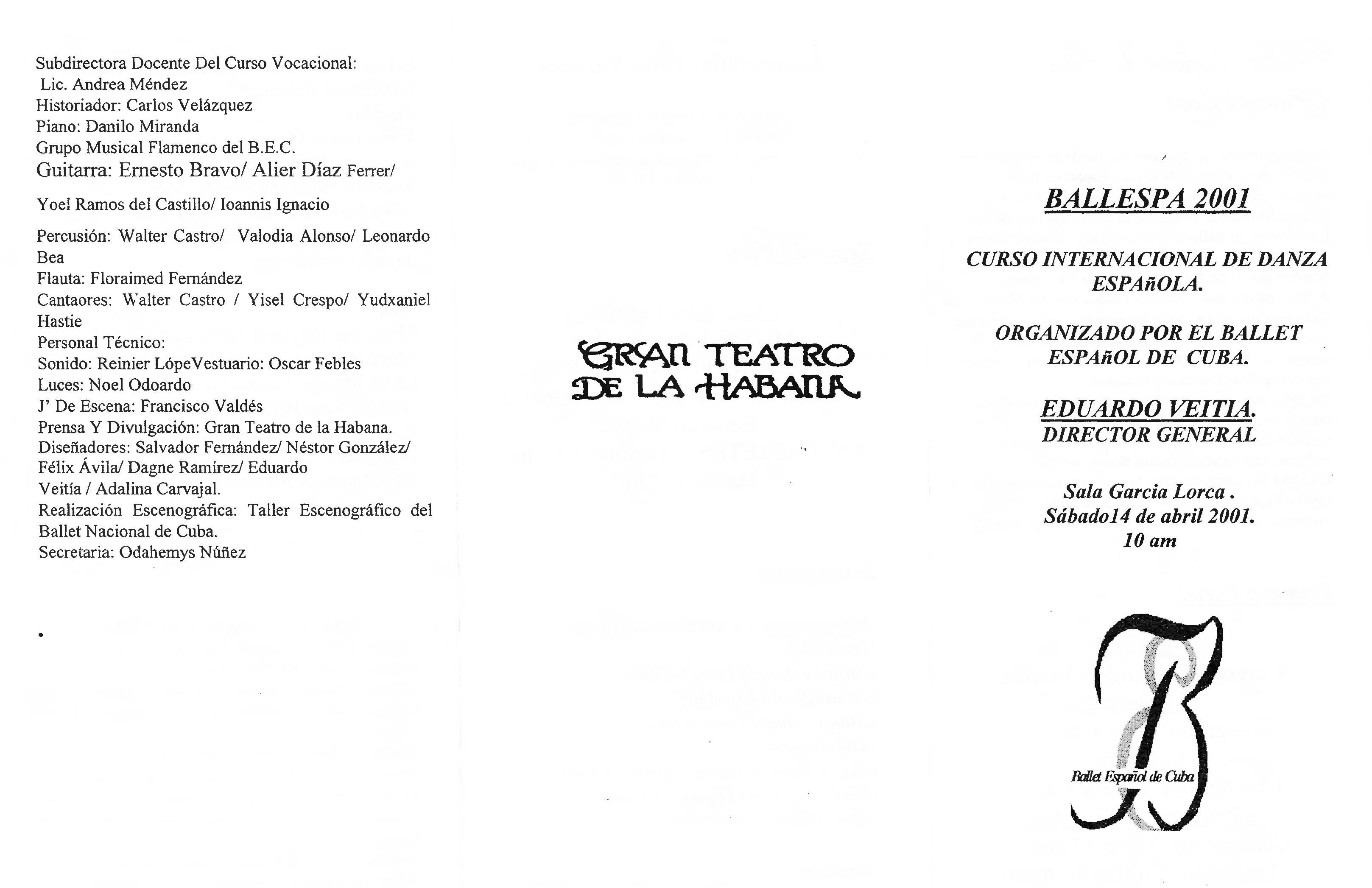 Programa de Ballespa "Curso Internacional de danza española" organizado por el Ballet Español de Cuba en el Gran Teatro de La Habana, Sala García Lorca, el 14 de abril de 2001 a las 10 am. Participació de Dunet Pi en la Segunda Parte "Capricho español" interpretando a "Maricarmen La aristócrata"
