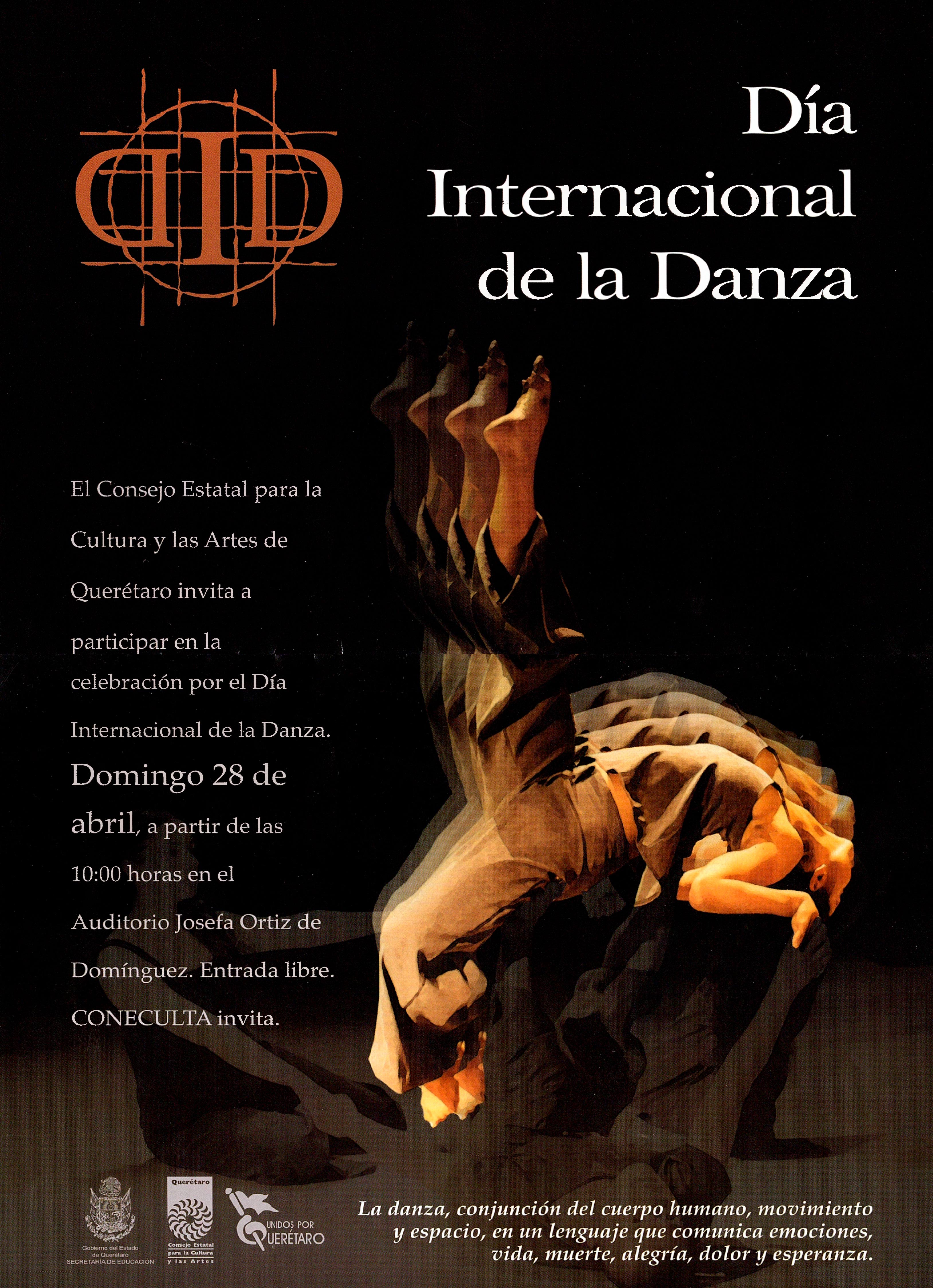 Cartel del Día Internacional de la Danza el domingo 28 de abril de 2002, a partir de las 10 hrs en el Auditorio Josefa. Entrada Libre. CONECULTA invita