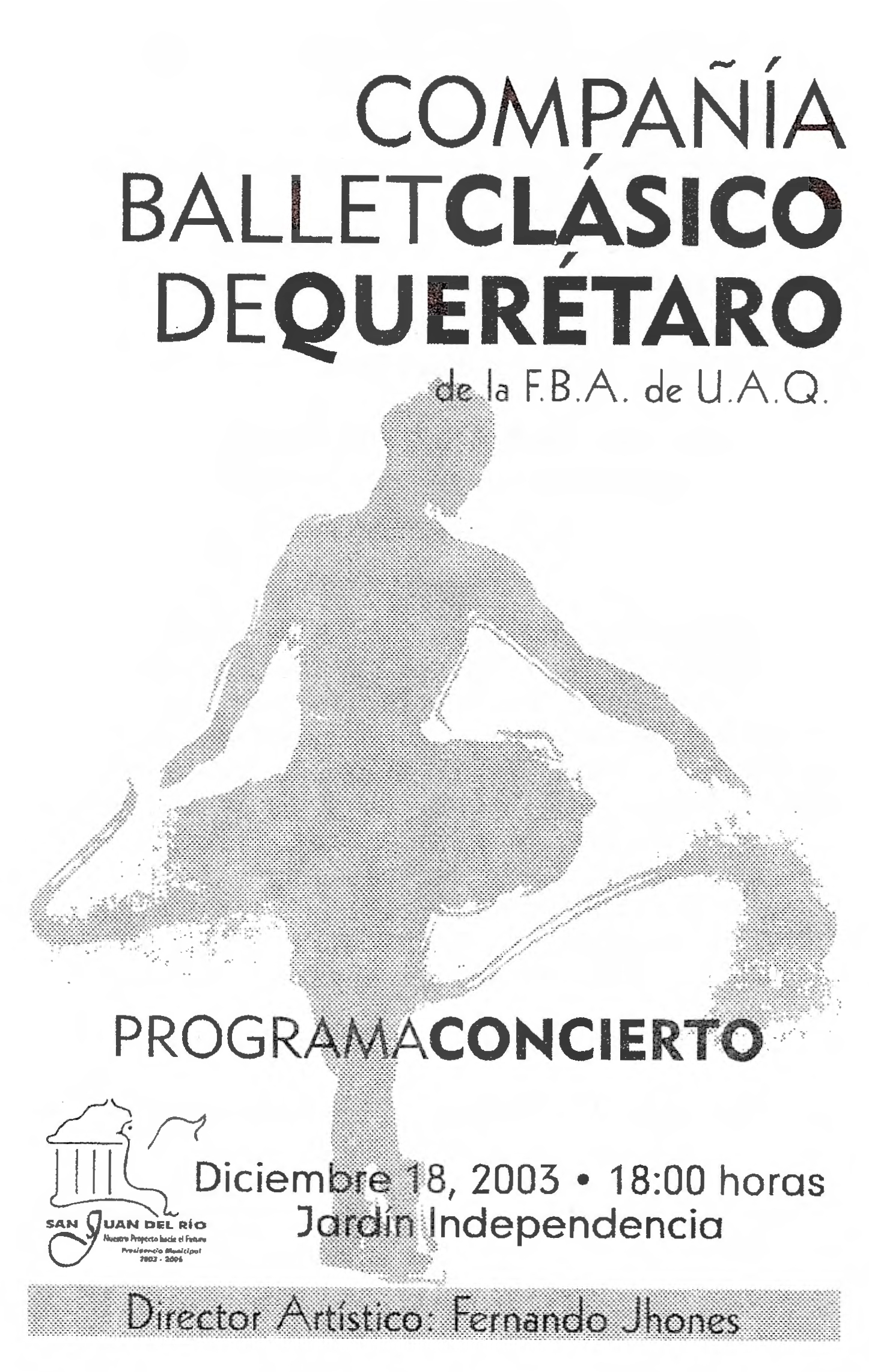 Programa Concierto. Diciembre 18, 2003 a las 18 hrs. Jardín Independencia, con el director artístico Fernando Jhones, presentando El Danzón, Pas de Deux de Cascanueces, Giselle (bailable del acto II)