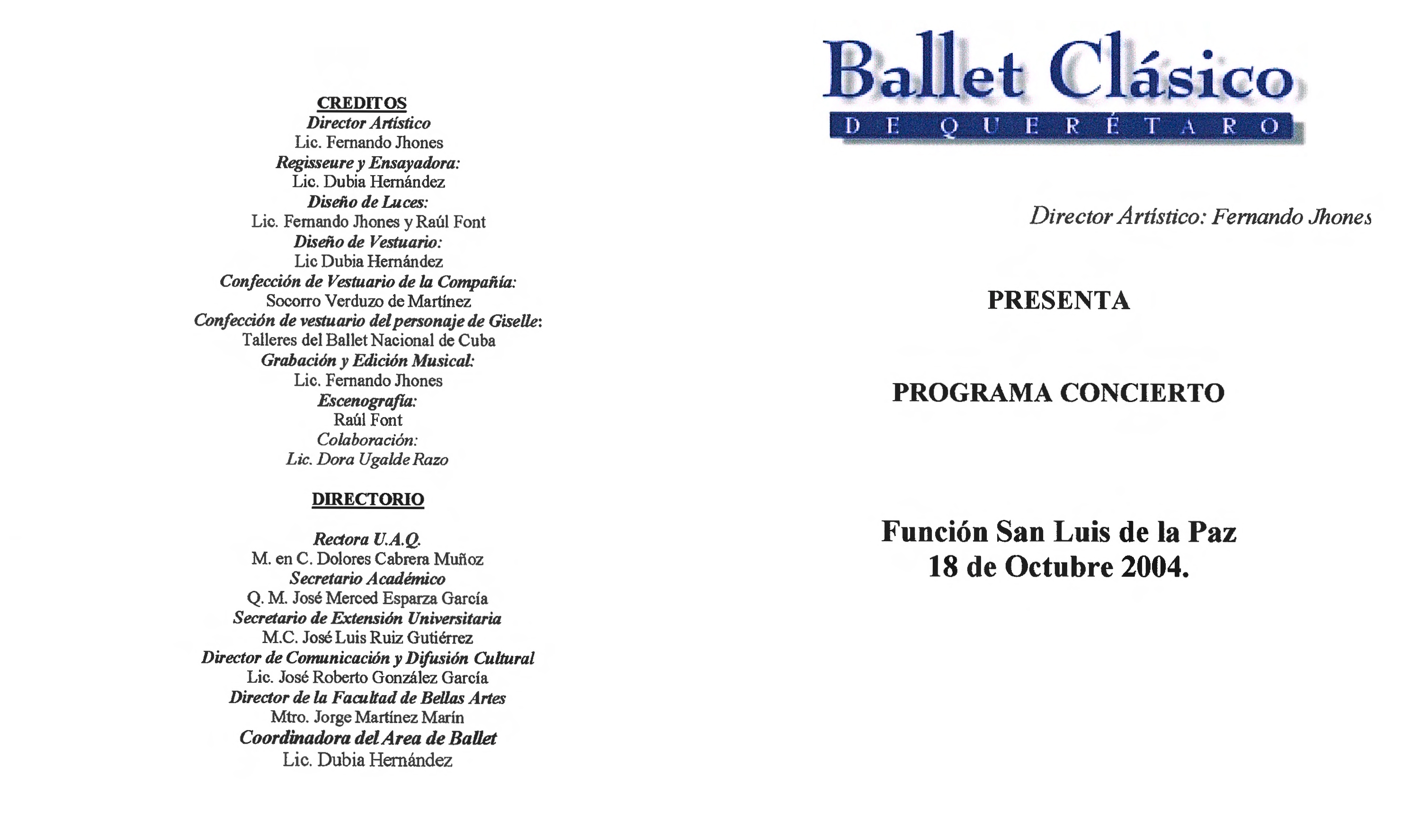 Ballet Clásico de Querétaro, “Programa Concierto San Luis de la Paz 2004,” ReDCA-Ballet, consulta 9 de marzo de 2026, http://redca.uaq.mx/ballet/items/show/722.