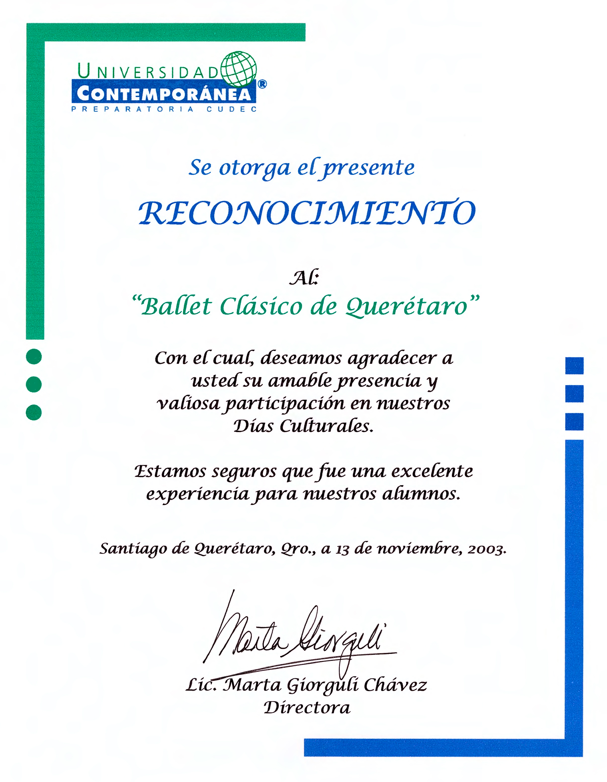 Ballet Clásico de Querétaro, “Reconocimiento Días Culturales 2003,” ReDCA-Ballet, consulta 9 de marzo de 2026, http://redca.uaq.mx/ballet/items/show/737.