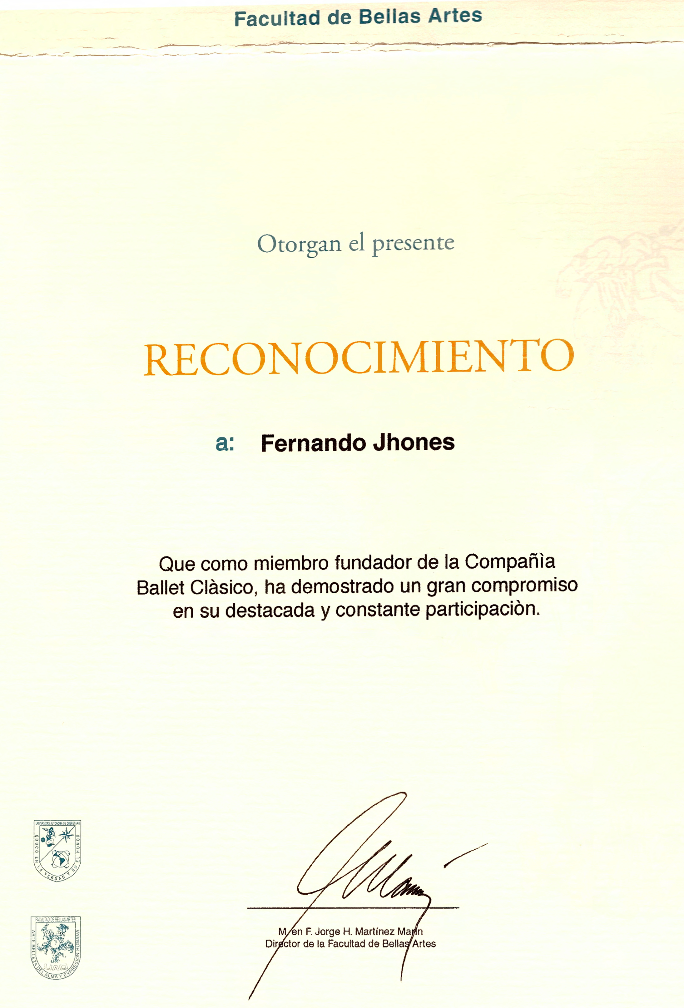 Fernando Jhones, “Reconocimiento 50 aniversario FBA 2003,” ReDCA-Ballet, consulta 9 de marzo de 2026, http://redca.uaq.mx/ballet/items/show/738.
