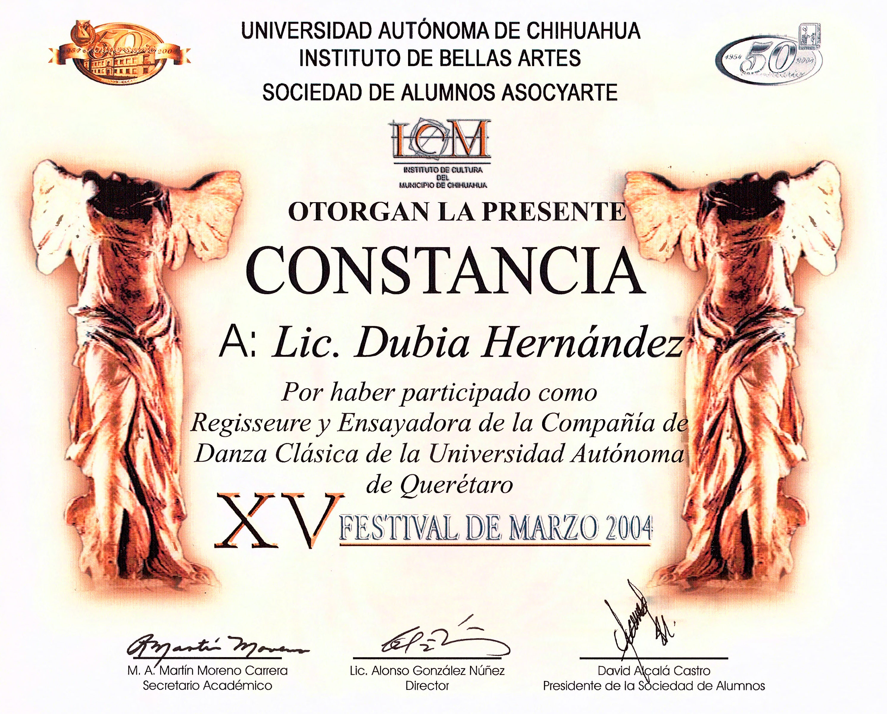 Reconocimiento por participar como Regisseure y Ensayadora de la Compañía de Danza Clásica de la UAQ en el XV Festival de Marzo