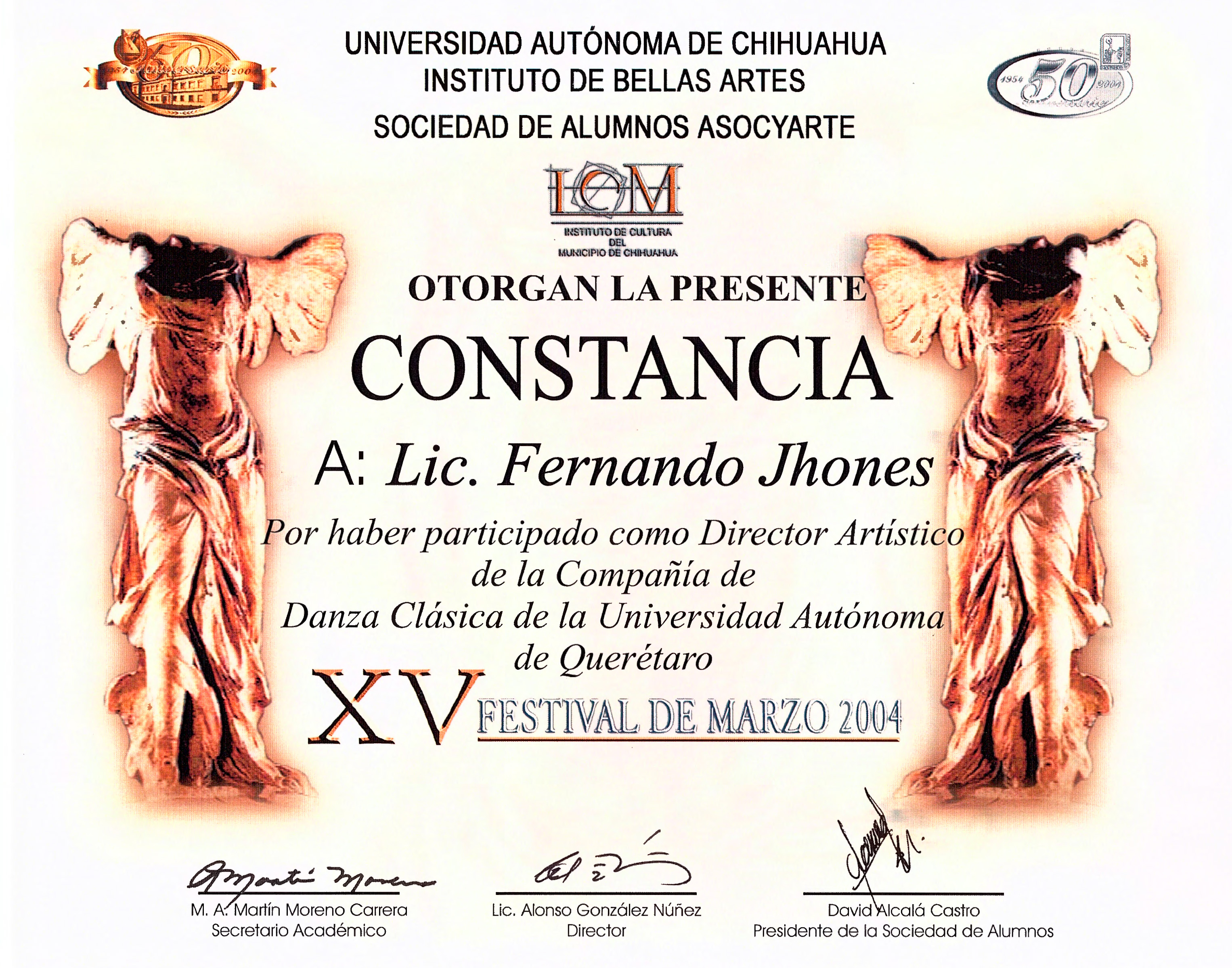 Fernando Jhones, “Reconocimiento por participar como Director Artístico,” ReDCA-Ballet, consulta 9 de marzo de 2026, http://redca.uaq.mx/ballet/items/show/745.