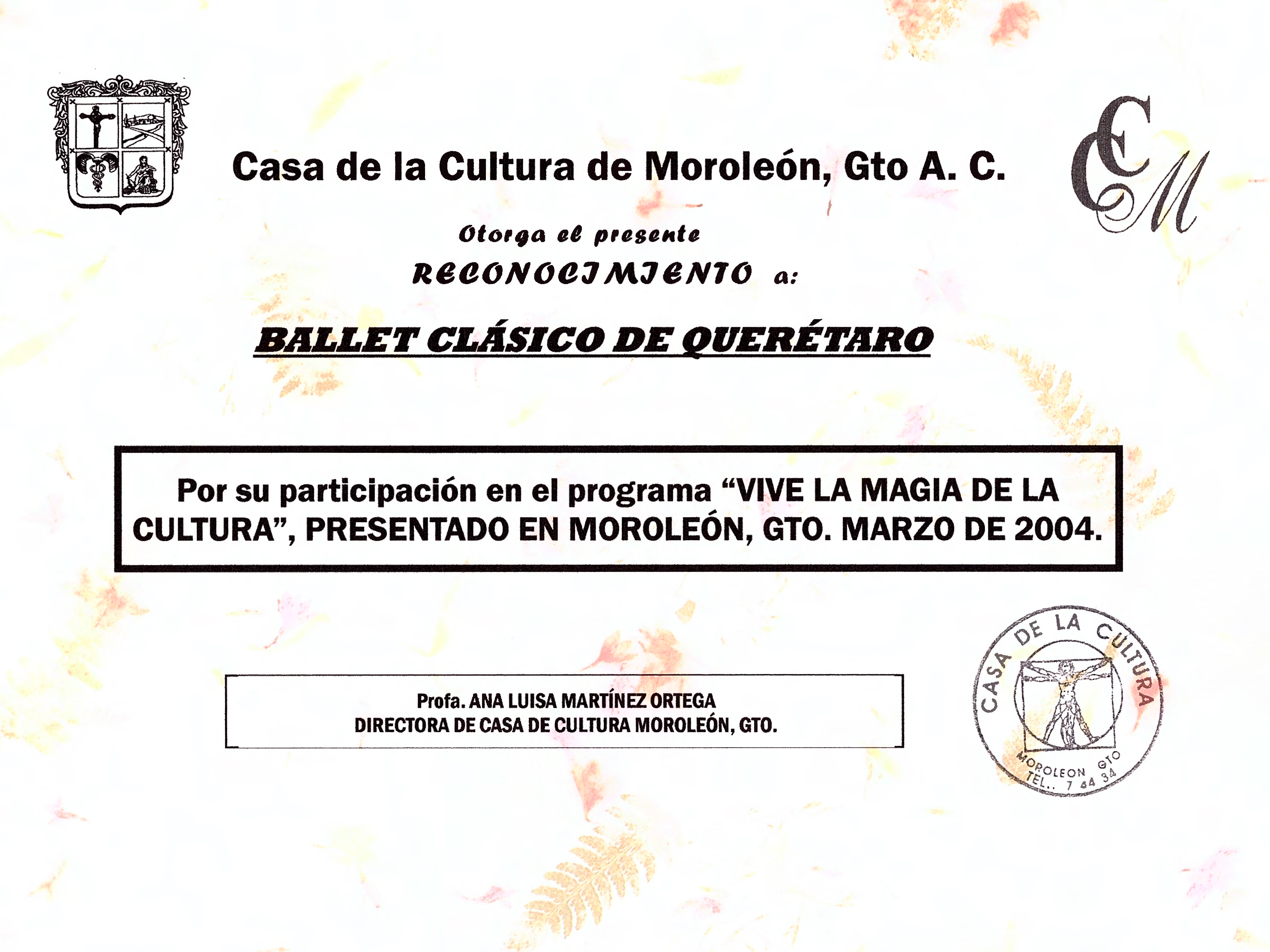 Ballet Clásico de Querétaro, “Reconocimiento Vive la Magia de la Cultura Moroleón,” ReDCA-Ballet, consulta 9 de marzo de 2026, http://redca.uaq.mx/ballet/items/show/747.