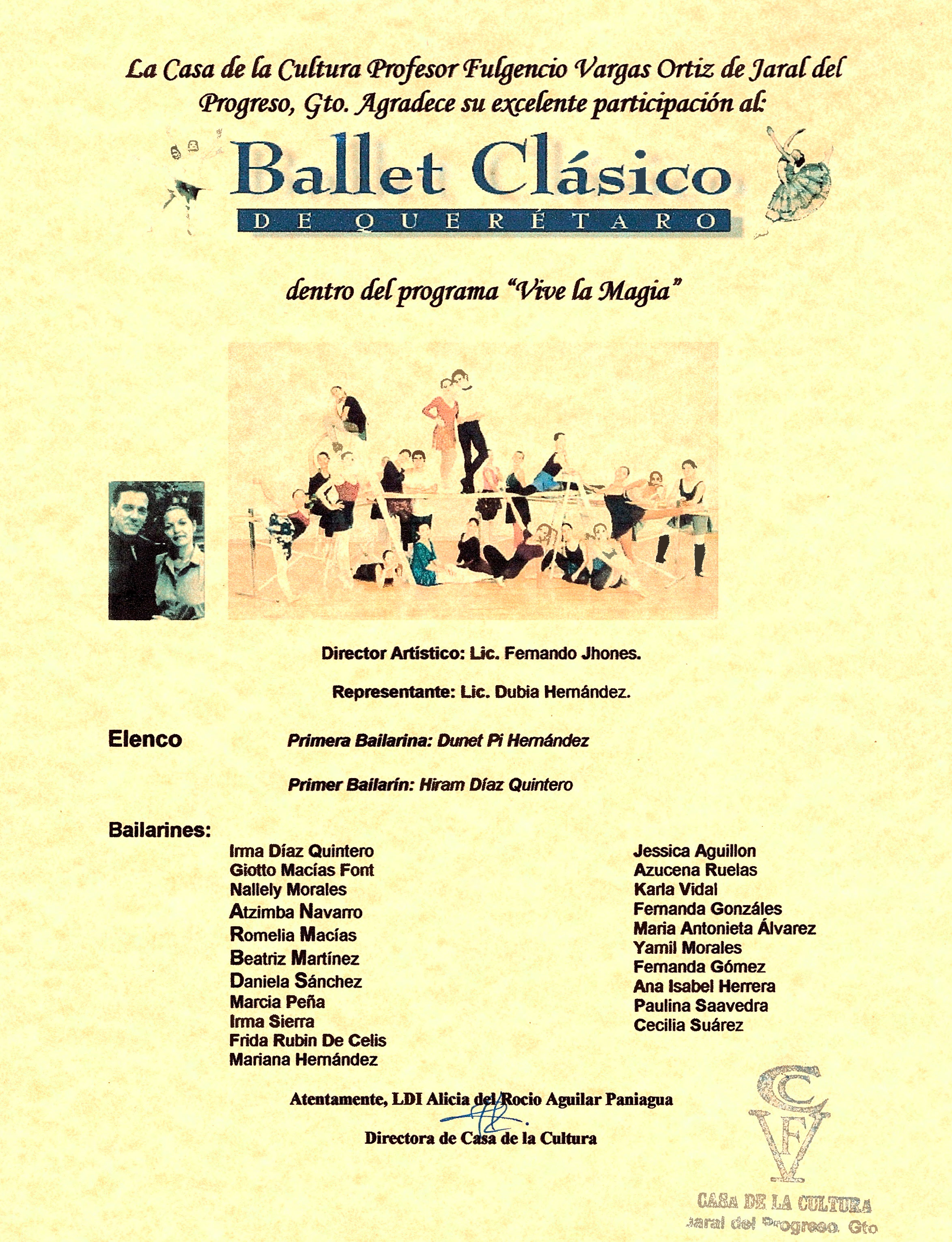 Reconocimiento por participación en festival Vive la Magia de la Cultura en la Casa de la Profesor Fulgencio Ortiz de Jaral del Progreso