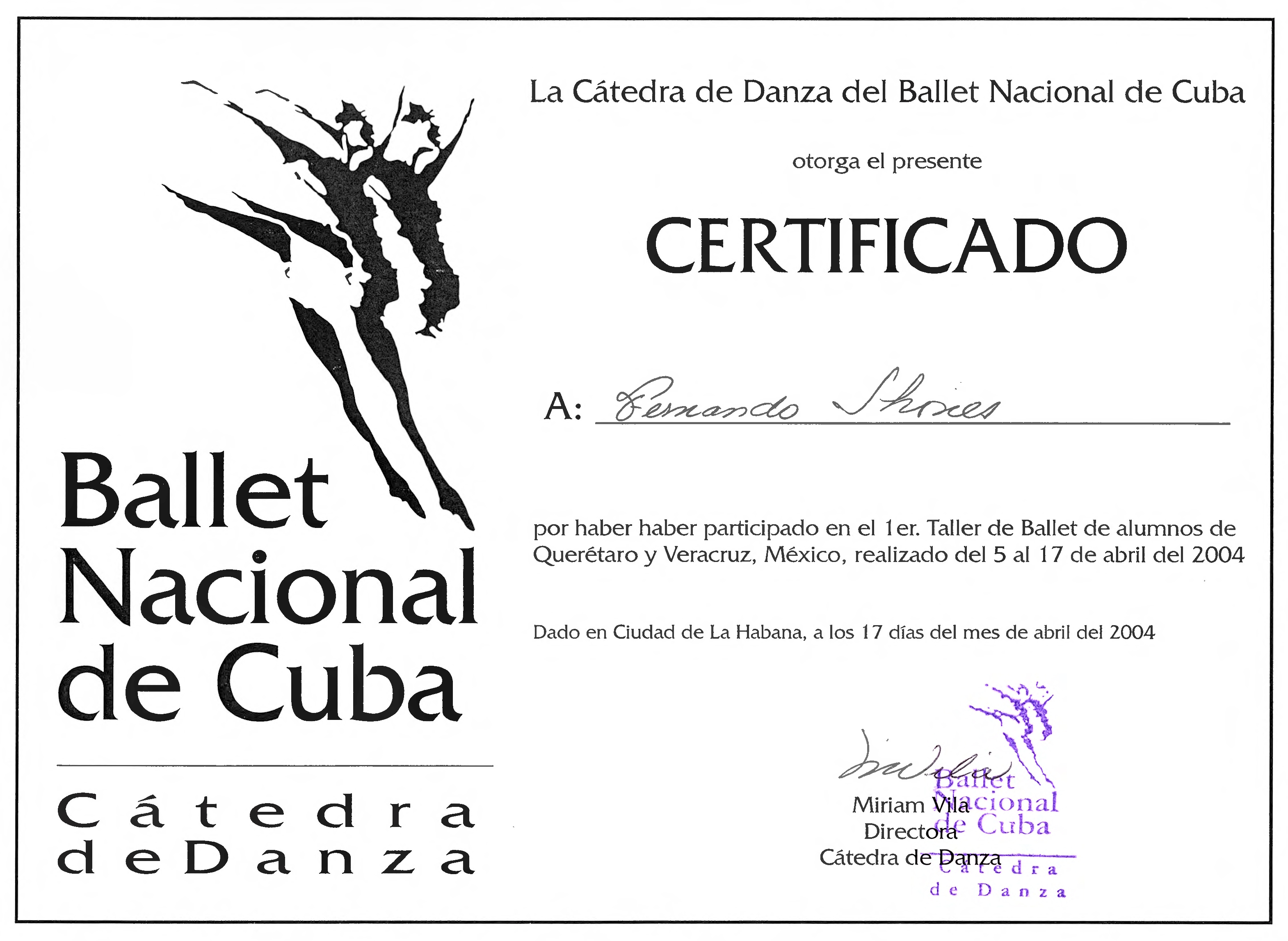 Certificado por haber participado en el 1er. Taller de Ballet de alumnos de Querétaro y Veracruz, México, realizado del 5 al 17 de abril en la Cátedra de Danza del Ballet Nacional de Cuba