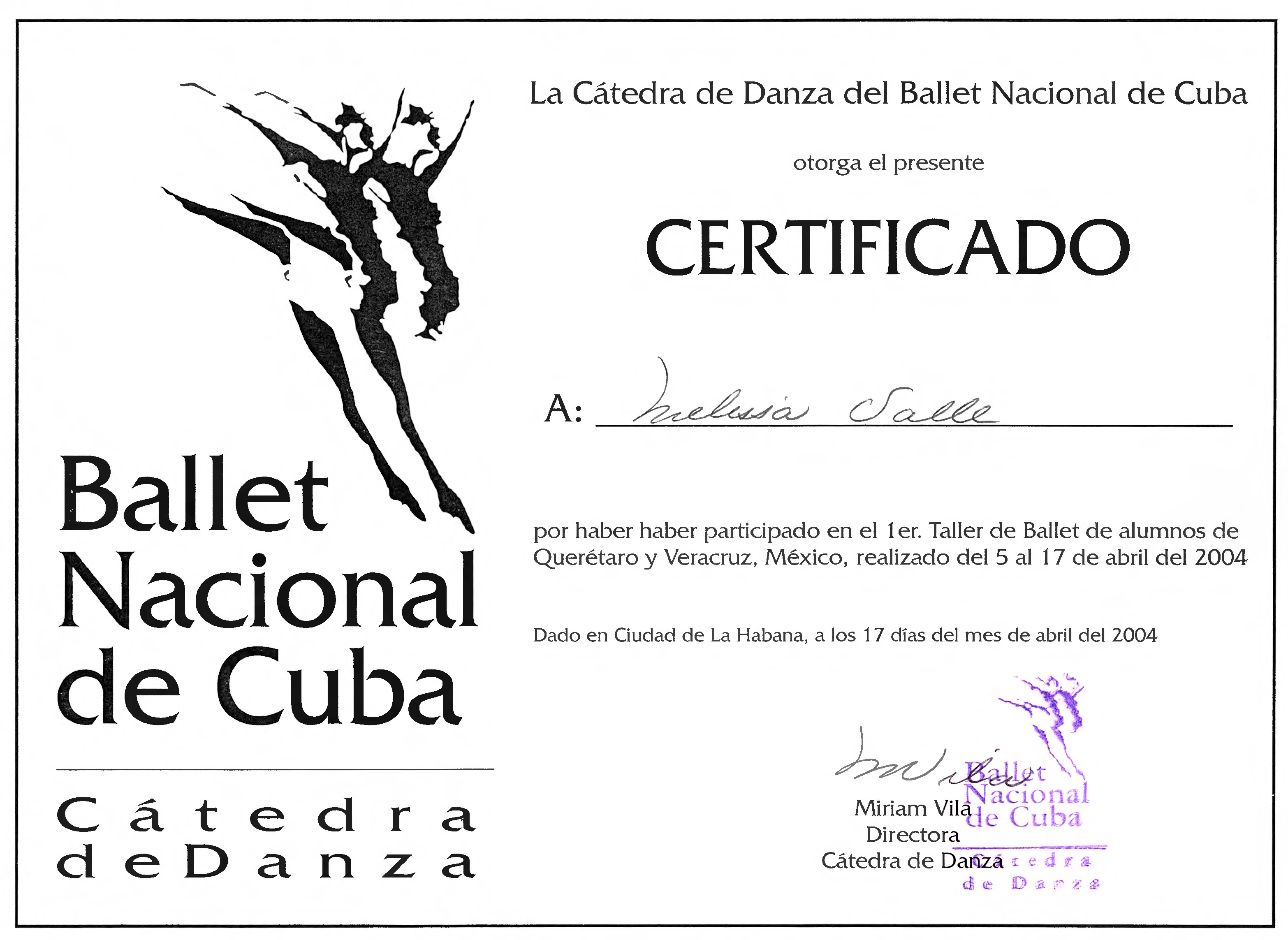 Certificado por haber participado en el 1er. Taller de Ballet de alumnos de Querétaro y Veracruz, México, realizado del 5 al 17 de abril en la Cátedra de Danza del Ballet Nacional de Cuba