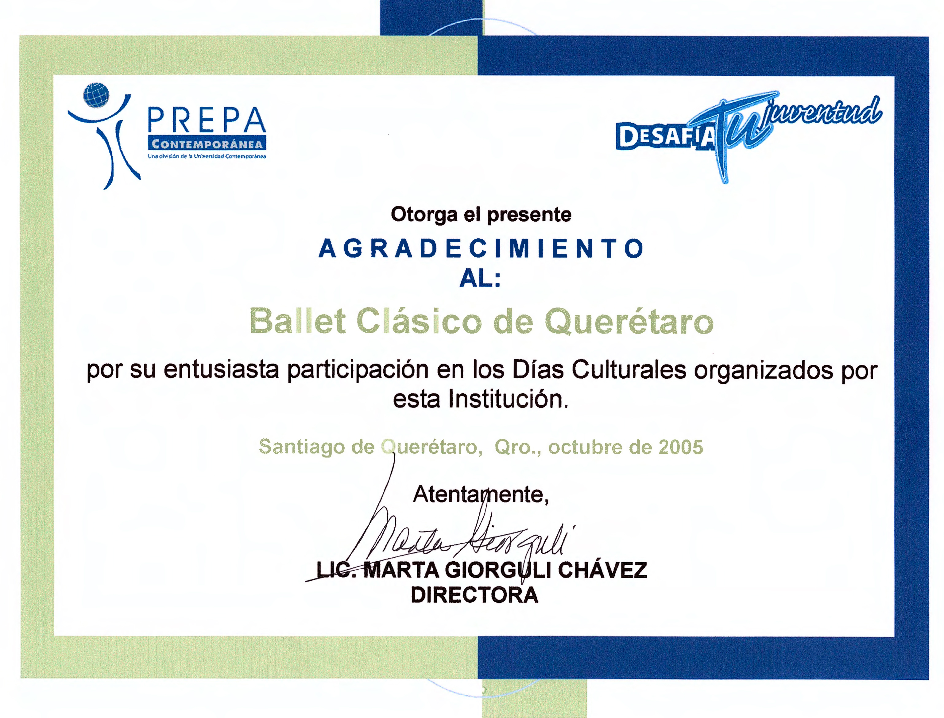 Ballet Clásico de Querétaro, “Reconocimiento Días Culturales Octubre 2005,” ReDCA-Ballet, consulta 9 de marzo de 2026, http://redca.uaq.mx/ballet/items/show/764.