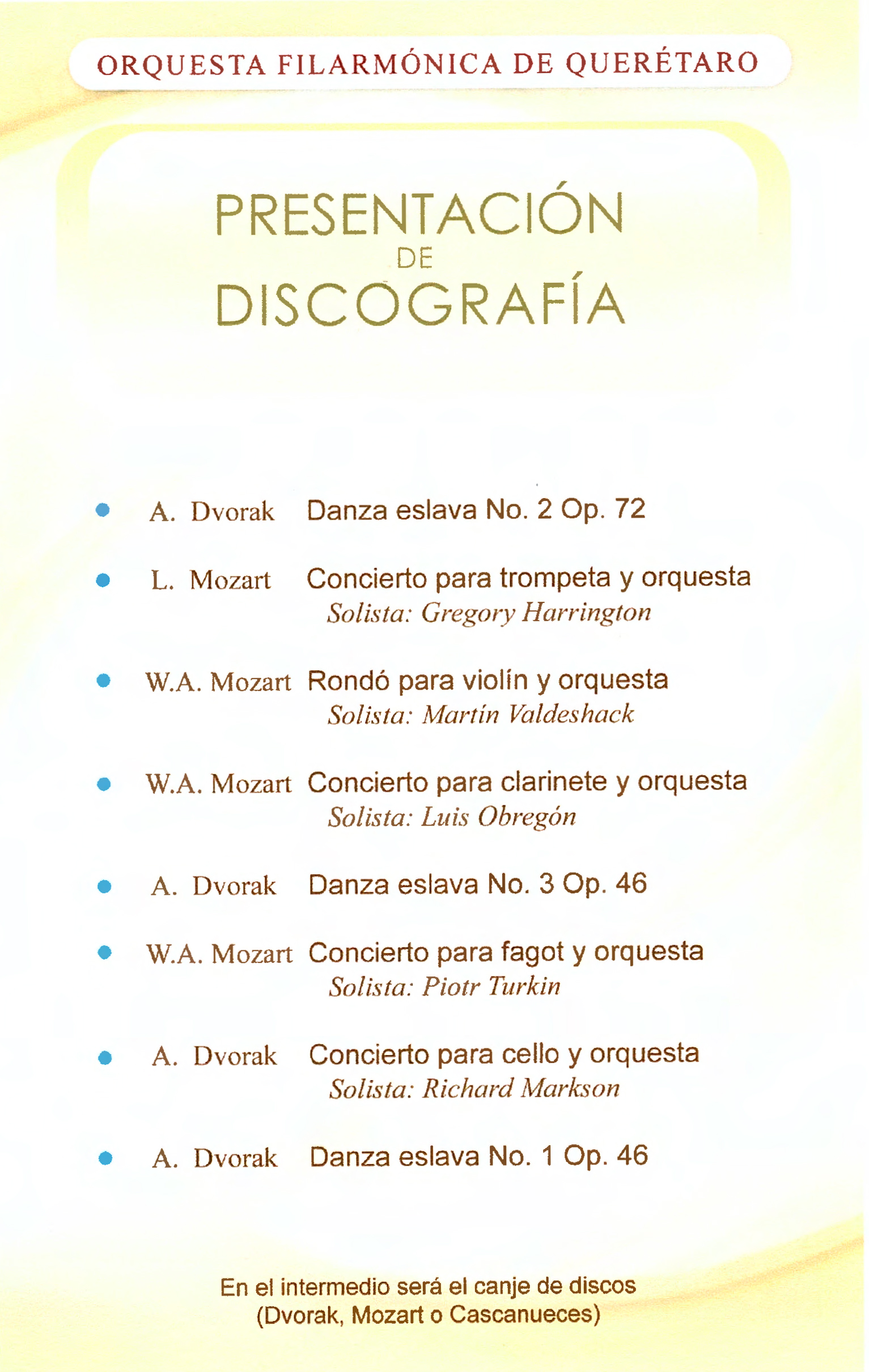 Programa de la segunda temporada de conciertos de primavera de la OFEQ en el Teatro de la República a las 20:30 hrs, presentación DVD El Cascanueces
