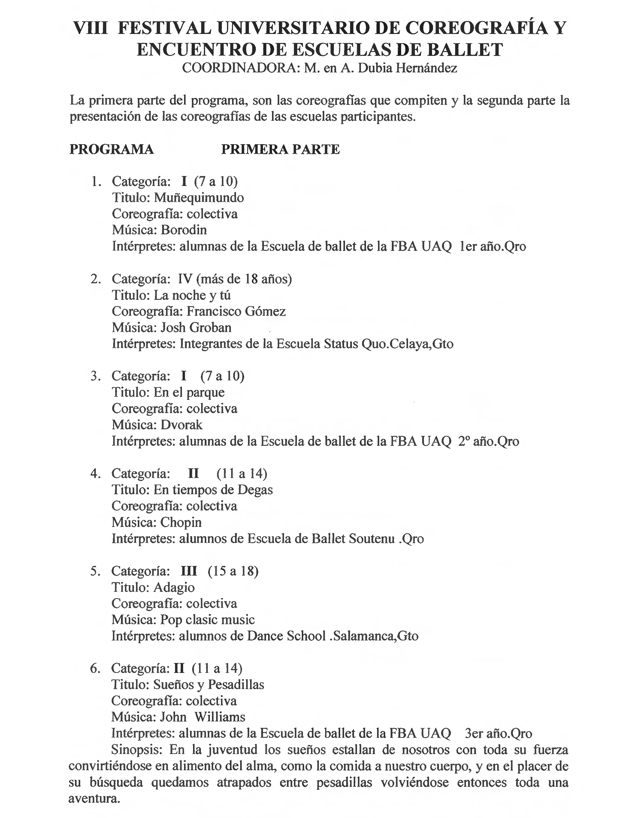 Dubia Hernández, “Programa VIII Festival Universitario de Coreografía y Encuentro de Escuelas de Ballet,” ReDCA-Ballet, consulta 9 de marzo de 2026, http://redca.uaq.mx/ballet/items/show/776.