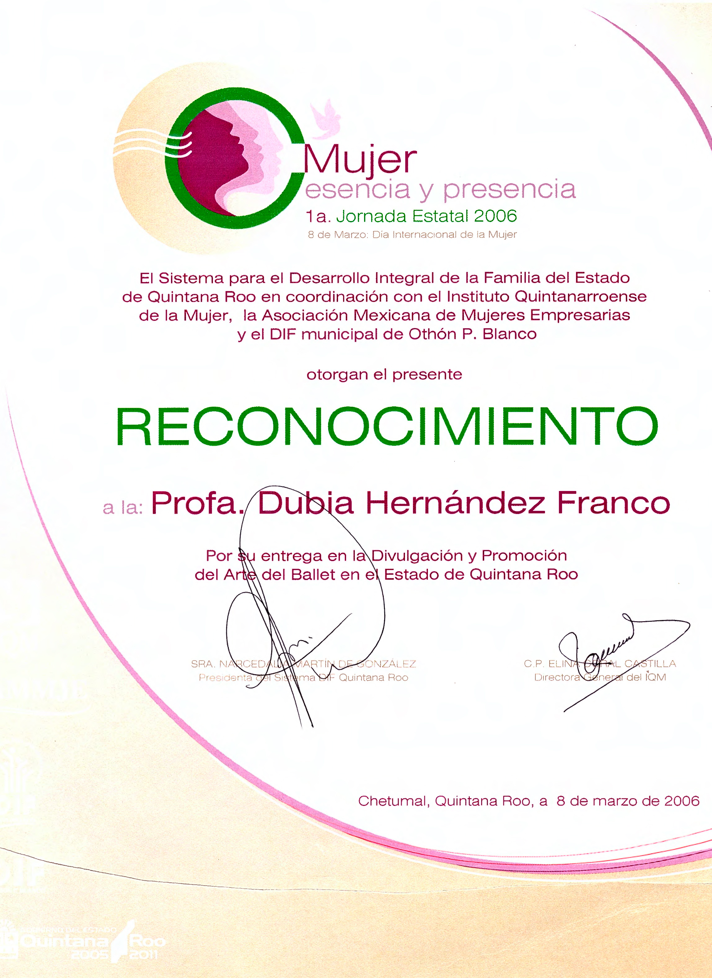 Reconocimiento por la Divulgación y la Promoción del Arte del Ballet en el Estado de Quintana Roo en la 1ra Jornada Estatal 2006 "Mujer esencia y presencia. 8 de marzo, Día Internacional de la mujer"