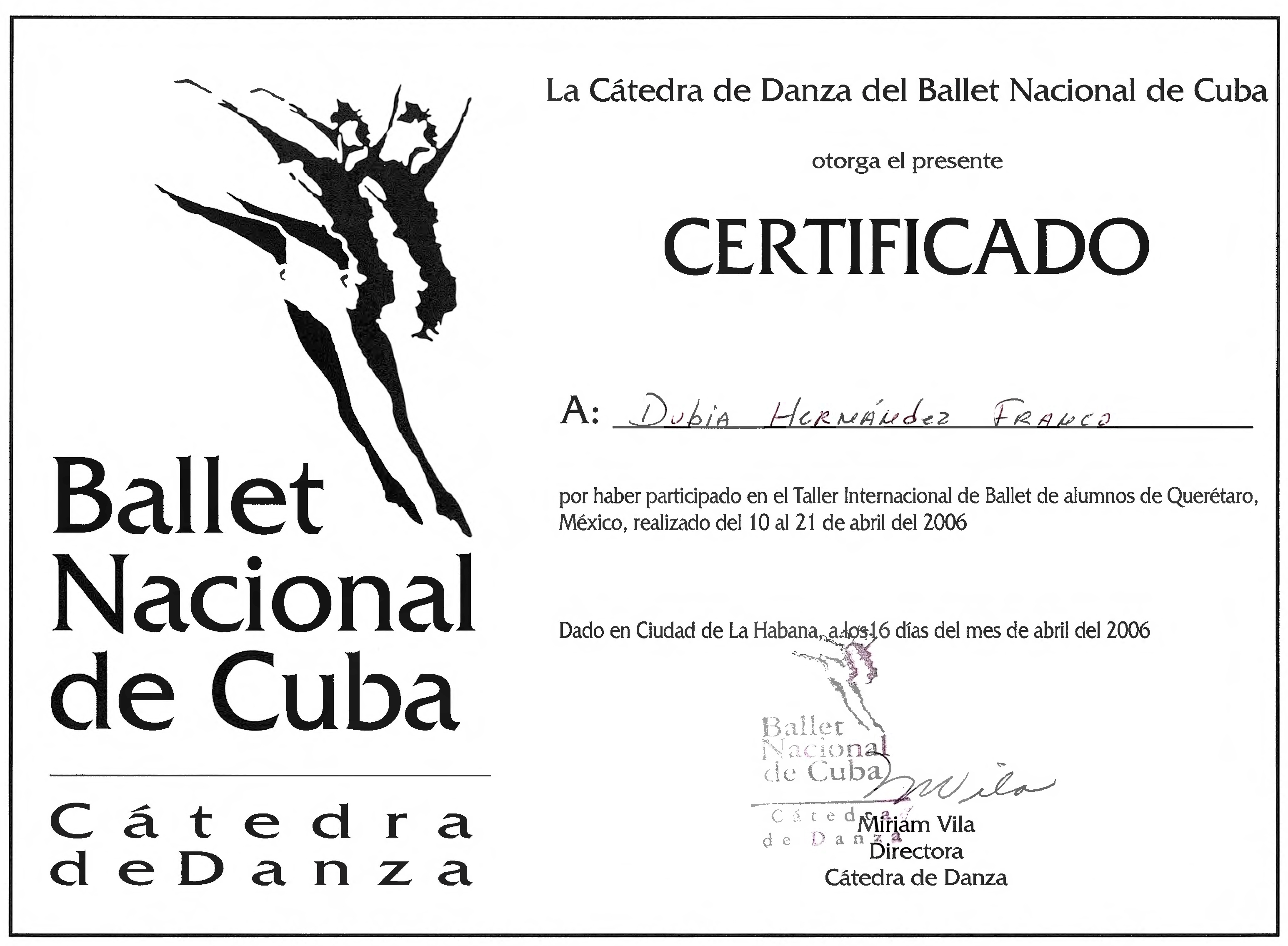 Reconocimiento por haber participado en el Taller Internacional de Ballet de alumnos de Querétaro en abril 2006 en la Cátedra de Danza del Ballet Nacional de Cuba