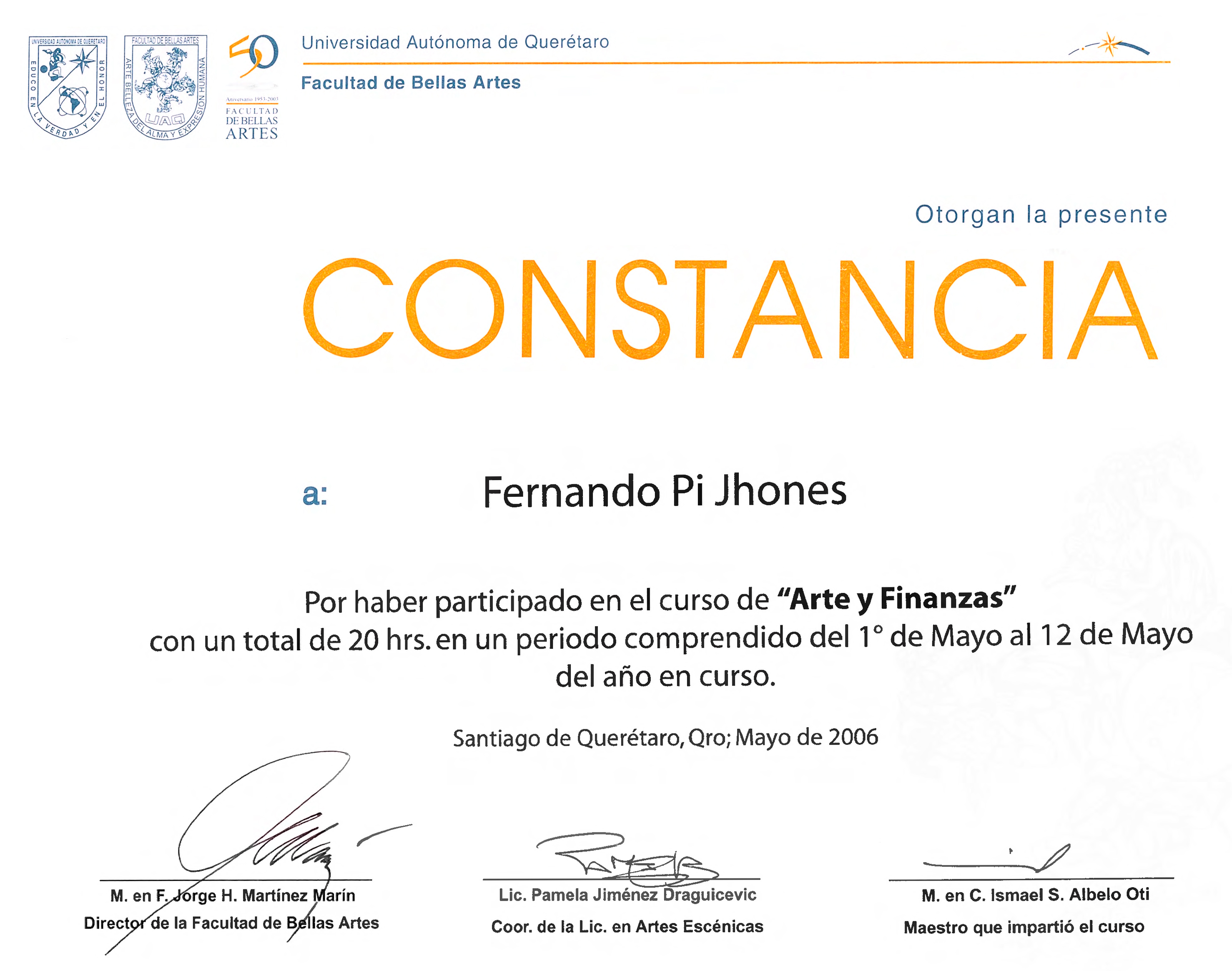Fernando Jhones, “Constancia curso de "Arte y Finanzas" 2006,” ReDCA-Ballet, consulta 9 de marzo de 2026, http://redca.uaq.mx/ballet/items/show/783.