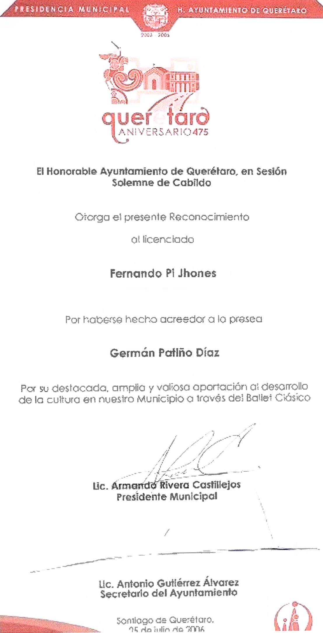 Fernando Jhones, “Reconocimiento por acreedor a presea "Germán Patiño Díaz",” ReDCA-Ballet, consulta 9 de marzo de 2026, http://redca.uaq.mx/ballet/items/show/785.