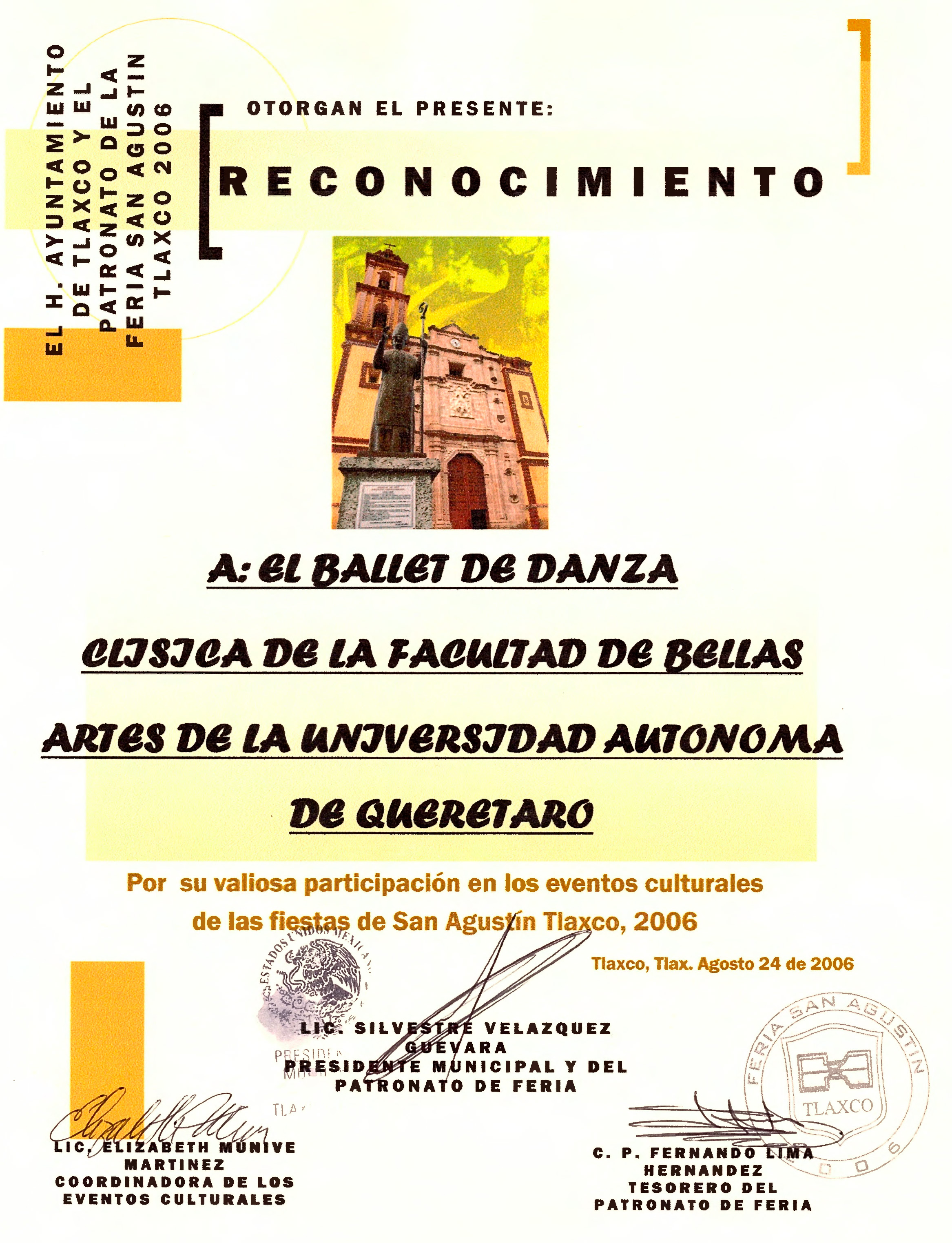 Ballet Clásico de Querétaro, “Reconocimiento Eventos Culturales de las fiestas de San Agustín Tlaxco,” ReDCA-Ballet, consulta 9 de marzo de 2026, http://redca.uaq.mx/ballet/items/show/787.